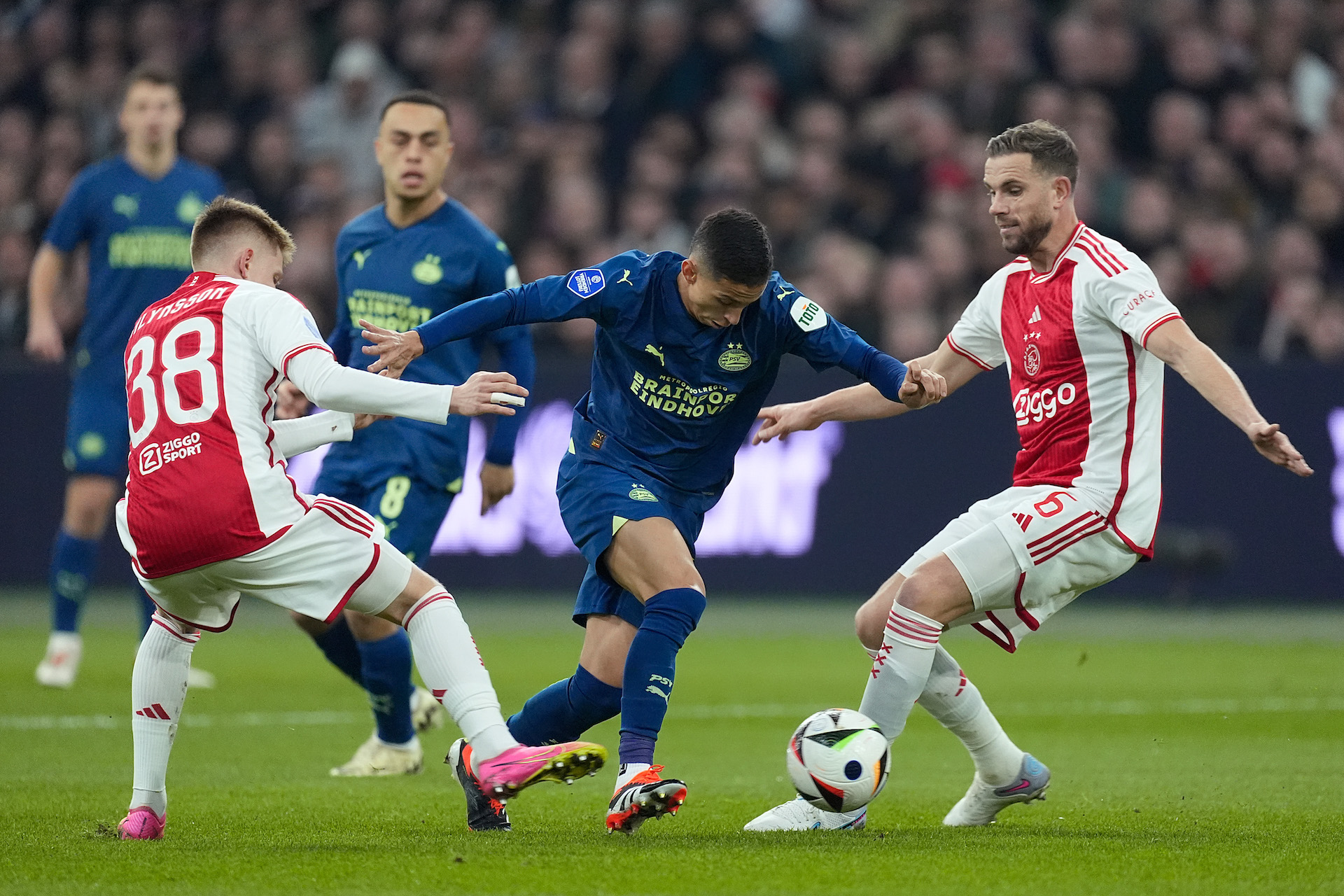 PSV vond nieuw elan in het doelpunt, maar Ajax komt er zo nu en dan gevaarlijk uit. Ondertussen is het bijna rust. De tijd vliegt in zo'n duel.