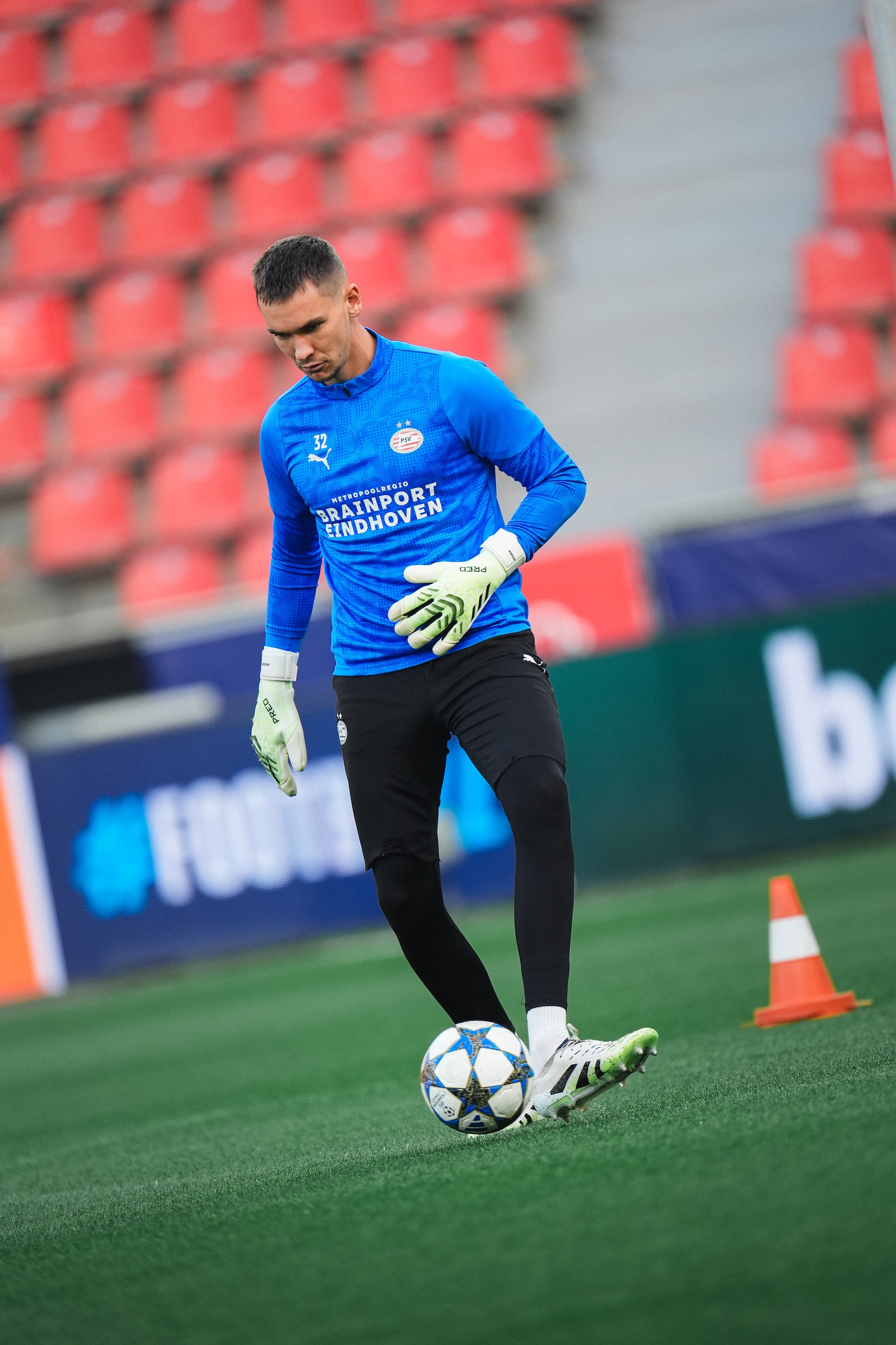 Matěj Kovář moet in de slotfase toch nog in actie komen en redt PSV knap. Met gestrekte armen weet hij de poging van de thuisploeg te keren.