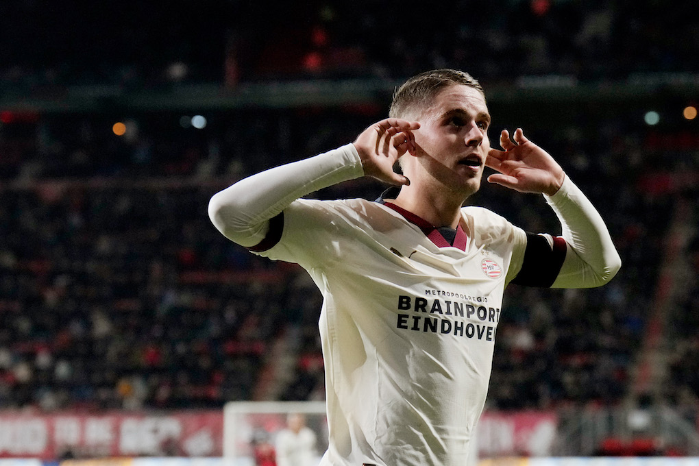 Guus Til kopt raak en zet PSV op voorsprong. In de eerste helft was de middenvelder ook al belangrijk met een assists op Ivan, nu was Ivan juist de aangever.