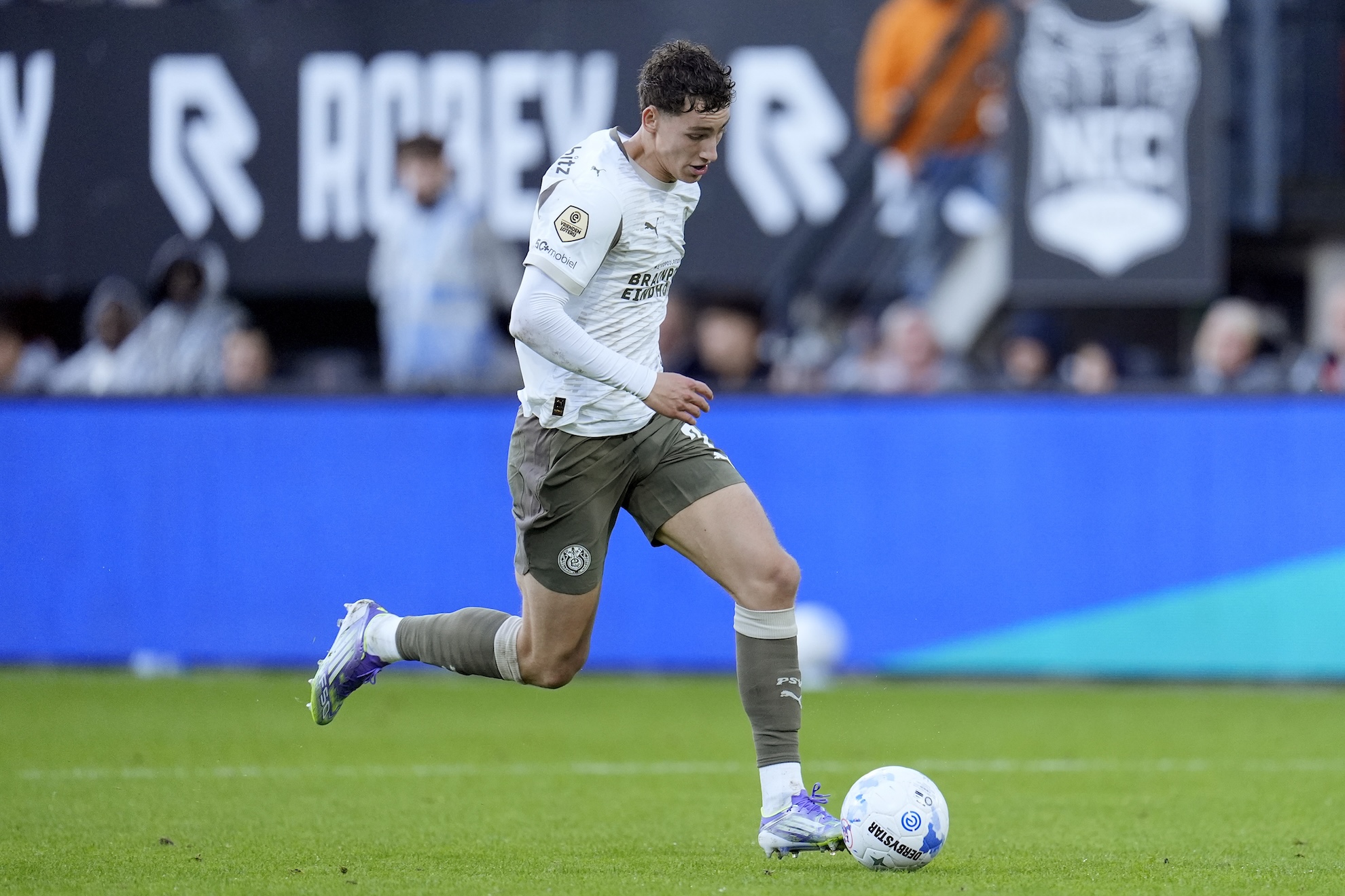 Er is afgetrapt in Nijmegen. Het gaat er meteen hard aan toe hier met N.E.C. dat PSV direct onder hoge druk probeert te zetten.