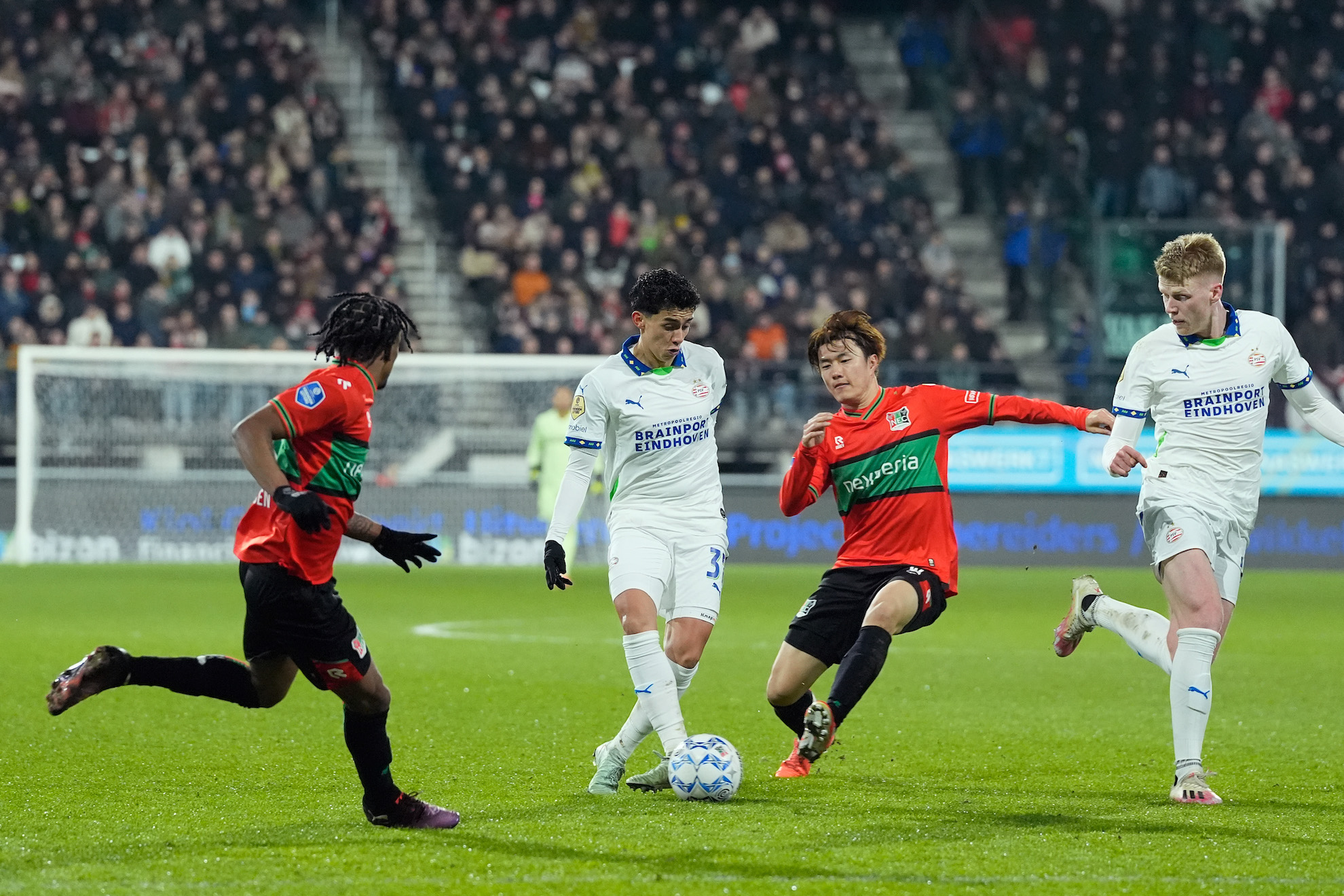 Er is wat gefriemel voor het doel van PSV en de bal belandt daarna net naast de rechterpaal. Waar PSV in de openingsfase het meeste balbezit heeft, weet NEC de grotere kansen te creëren.