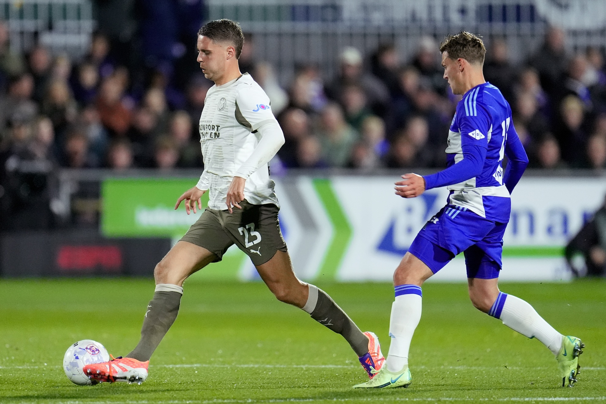 Kaj de Rooij beproeft zijn geluk met een schot van dichtbij, maar Joey Veerman gooit zich ervoor.