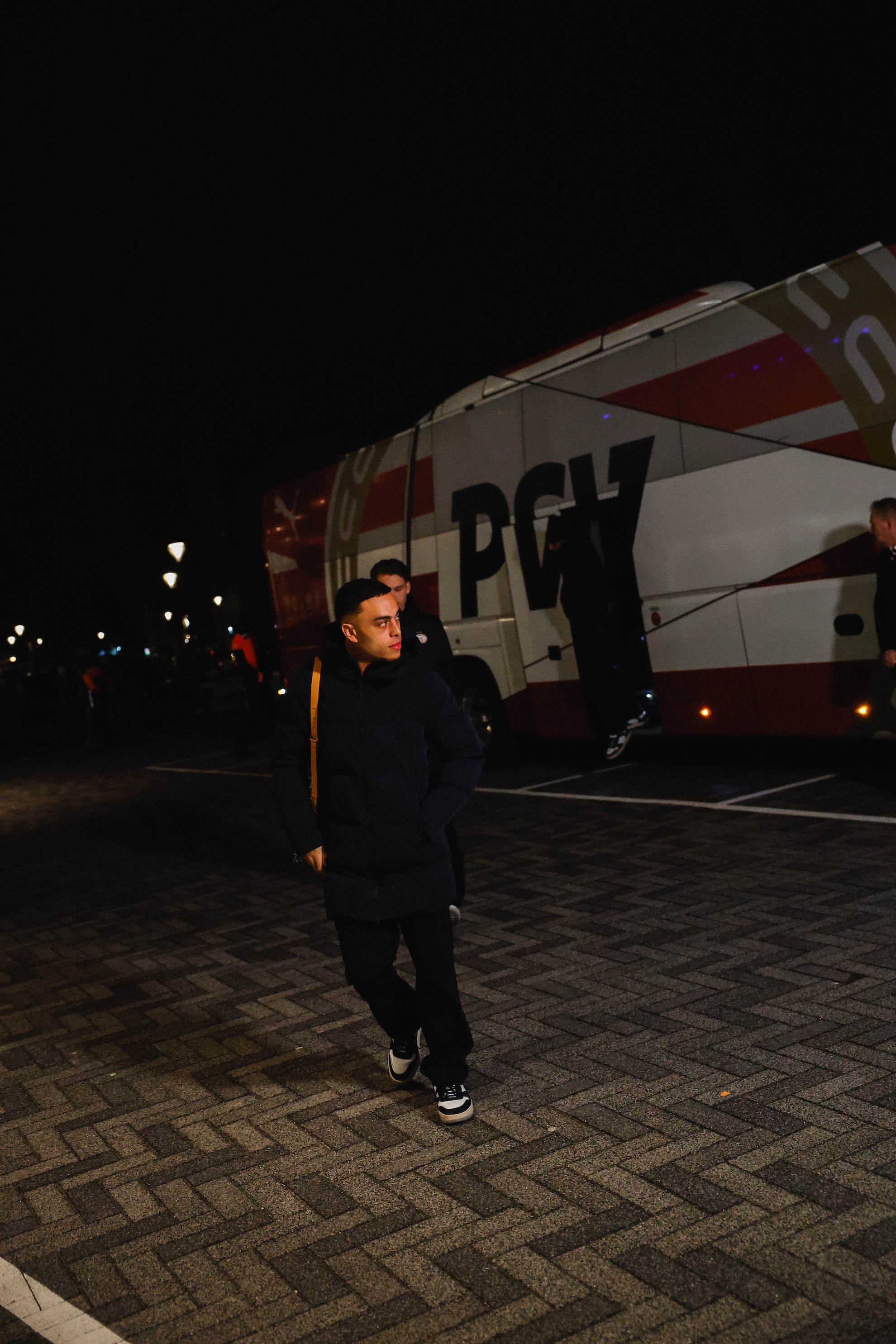 Met een prachtig verlicht Philips Stadion en het nieuws over de verlenging van de samenwerking met ASML zit de sfeer er hier meteen goed in. We staan op het punt om te beginnen.