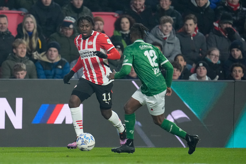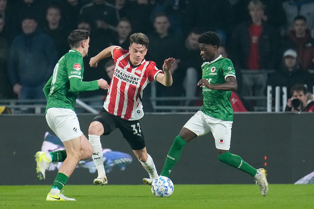 Een mogelijkheid voor Guus Til, die de bal toegespeeld krijgt van Joey Veerman en alleen voor de keeper komt - of niet helemaal alleen, want een Excelsior verdediger steekt er een stokje voor.
