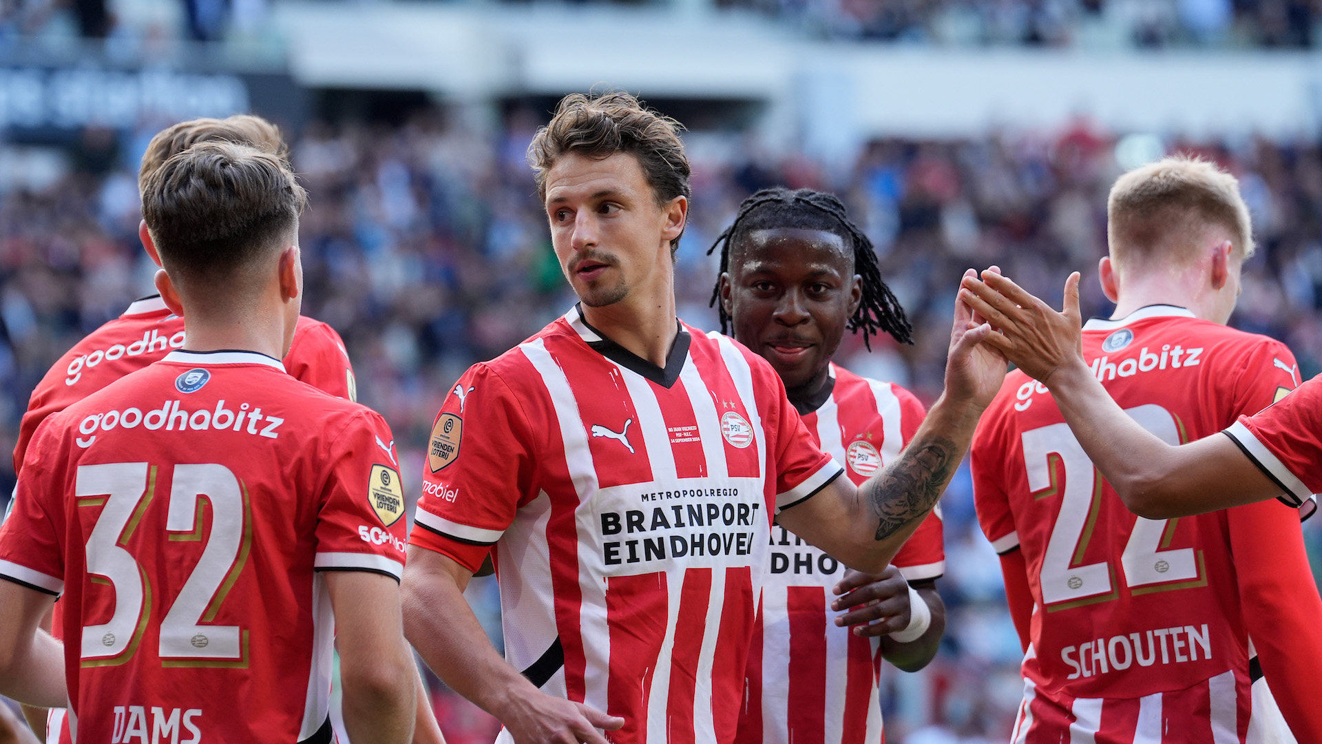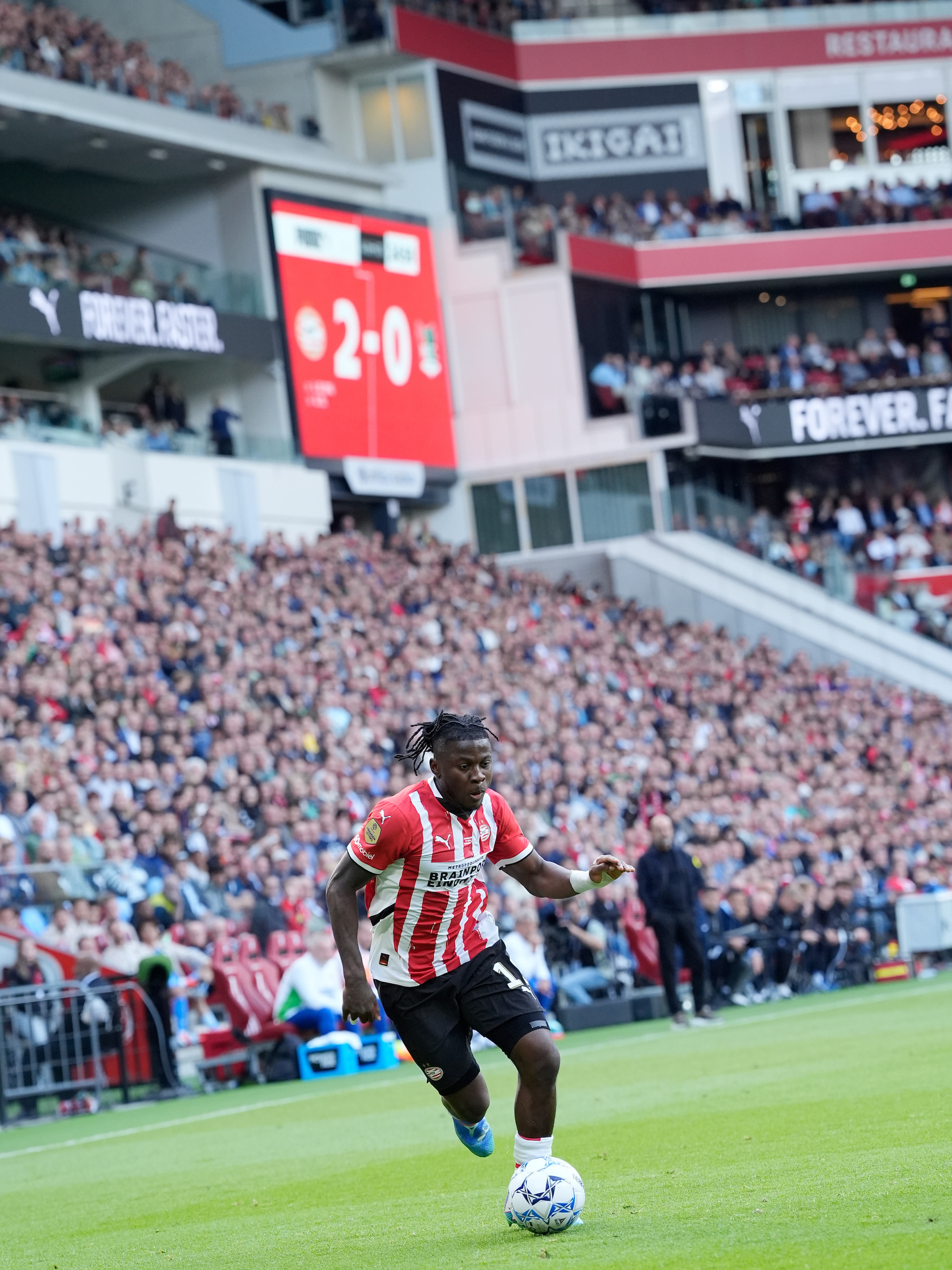 Een geweldige pass van Olivier Boscagli leidt tot een doorbraak van Guus Til, die onreglementair wordt gevloerd. Een rode kaart voor de bezoekers en een penalty voor PSV.