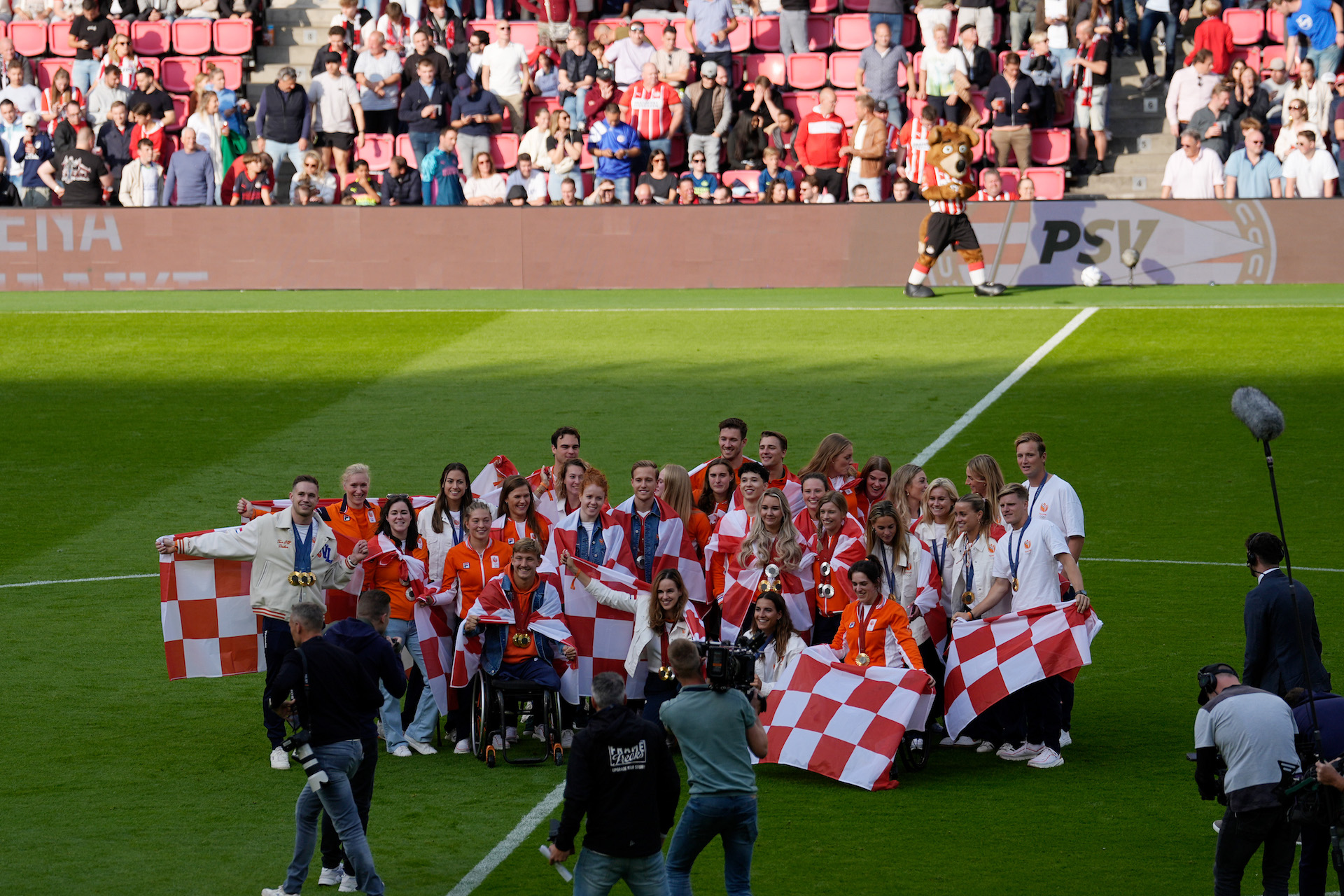 De Noord-Brabantse Olympiërs en Paralympiërs zijn gehuldigd in het Philips Stadion. Harrie Lavreysen, die in Parijs drie keer goud pakte bij het baanwielrennen, vond het geweldig: "Ik kom hier uit de buurt en iedereen thuis is voor PSV. Om dan hier zo het veld op te mogen om nog een keer een feestje te vieren is heel gaaf."