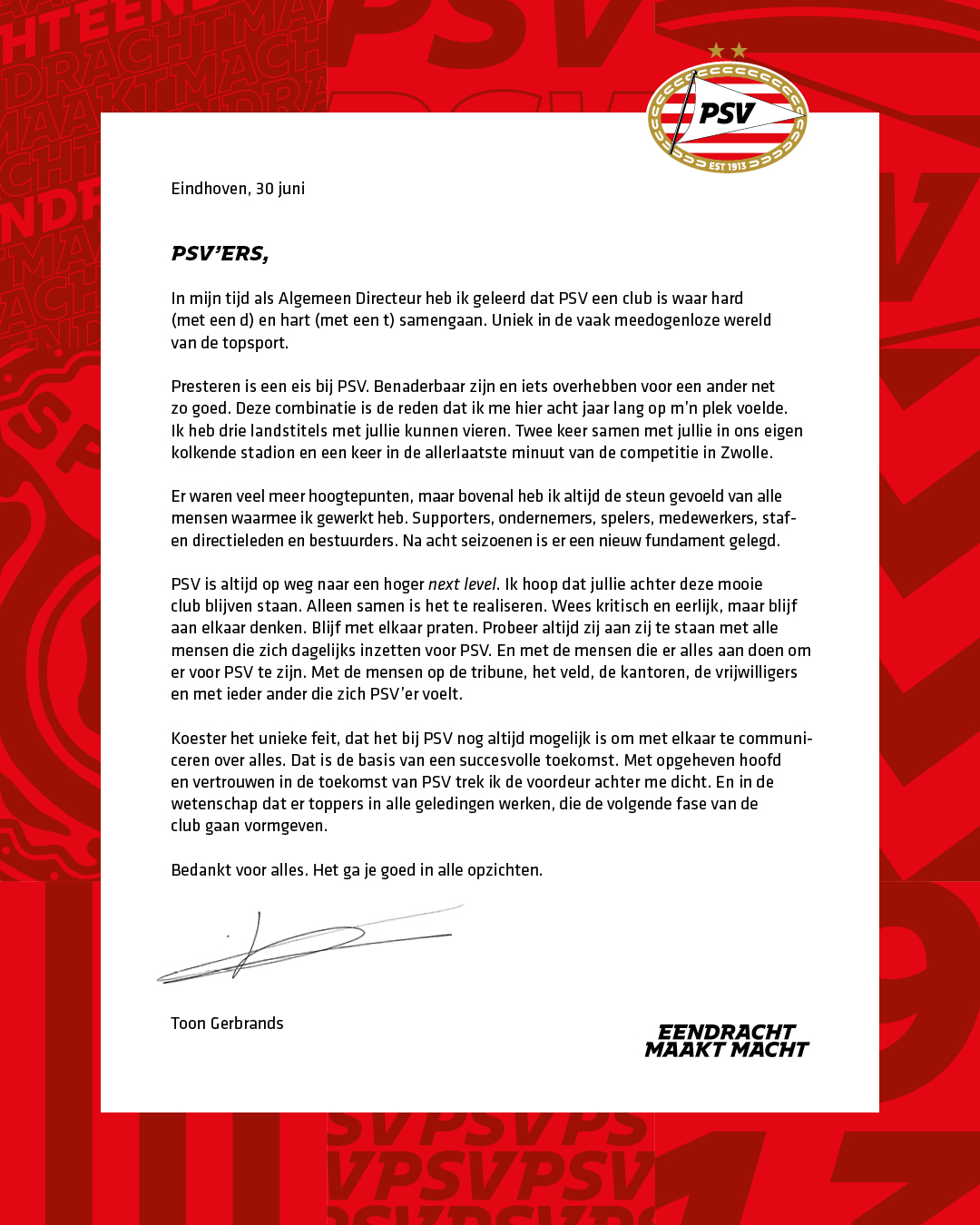 30 juni 2022 is officieel de laatste werkdag van Toon Gerbrands als Algemeen Directeur van PSV. Met onderstaande afscheidsboodschap richt hij zich tot alle PSV'ers.