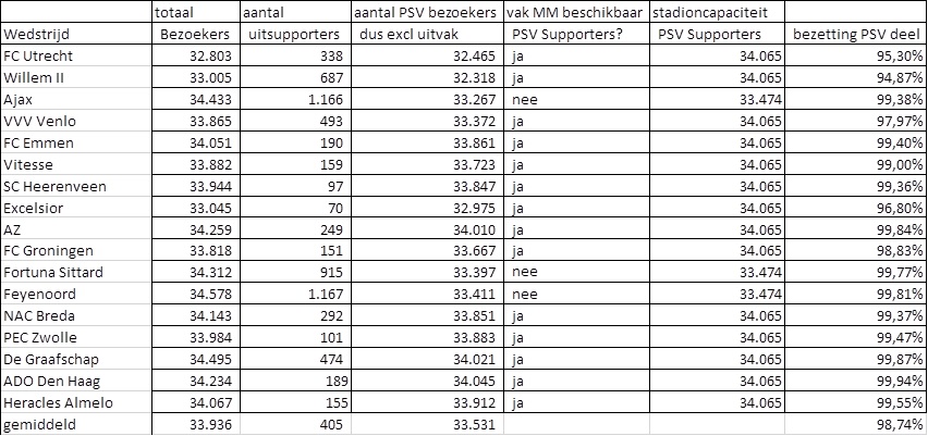 Hoe komt het gemiddeld percentage van 98.74% nou precies tot stand? Dat gaat op een enigszins ingewikkelde manier, legt Schroots uit. “Om te kunnen berekenen hoeveel stoelen er voor PSV-supporters beschikbaar zijn tijdens een thuiswedstrijd, moeten we eerst weten of vak MM (dat normaal gesproken gereserveerd is voor bezoekers van de uitspelende club, red.) beschikbaar komt voor PSV-supporters. Is het antwoord op die vraag ‘ja’, dan kunnen er maximaal 34.065 supporters van PSV een thuiswedstrijd bezoeken. Is het antwoord ‘nee’, dan mogen maximaal 33.474 PSV-fans een ticket kopen.” Zo kan het bijvoorbeeld zijn dat er tijdens PSV - Feyenoord in absoluut aantal minder PSV-supporters in het Philips Stadion zitten dan tegen NAC Breda. In percentage is dit aantal echter hoger omdat er tegen NAC Breda meer stoeltjes beschikbaar zijn voor PSV-supporters.