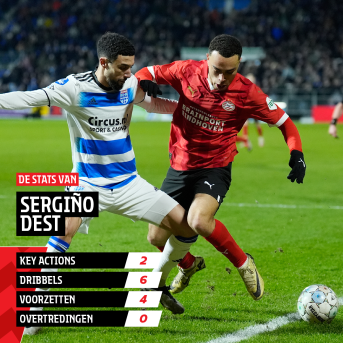 Voor de zesde keer dit seizoen noteerde Sergiño een assist. De Amerikaan passeerde Younes Namli en vond via zijn linkervoet het hoofd van Johan Bakayoko, die de bal overtuigend achter PEC Zwolle-goalie Jasper Schendelaar knikte. Naast het uitschakelen van zijn directe tegenstander, slaagde hij er ook in om aanvallend gevaar van de thuisploeg op zijn flank te neutraliseren.