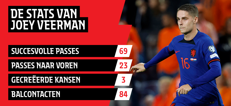 Joey Veerman liet zich op dinsdagavond gelden in het shirt van het Nederlands Elftal. De middenvelder speelde slechts één helft van de wedstrijd mee, maar kwam desondanks tot geweldige statistieken. Met name in zijn passing was hij loepzuiver.