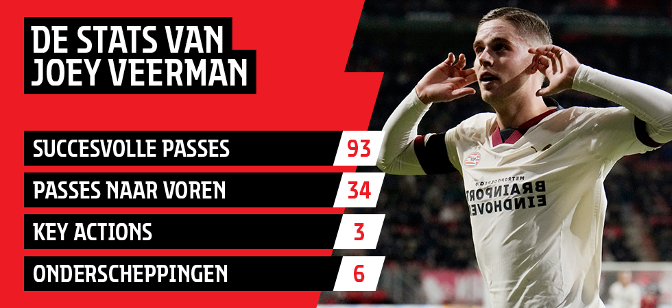 Met een goede loopactie en strakke afronding, zorgde Joey vlak voor rust voor de voorsprong. Toch was het wederom zijn passing waarmee de spelverdeler het meest uitblonk. Van zijn 98 passes kwam 89% daadwerkelijk aan bij een teamgenoot. 35% van zijn passes speelde hij naar voren. De Volendammer leed daarnaast slechts vijf keer balverlies. Dit zijn op zichzelf al noemenswaardige statistieken, maar het is nog indrukwekkender als je bedenkt dat Joey regelmatig ballen naar een drukbezette zestien verstuurt.