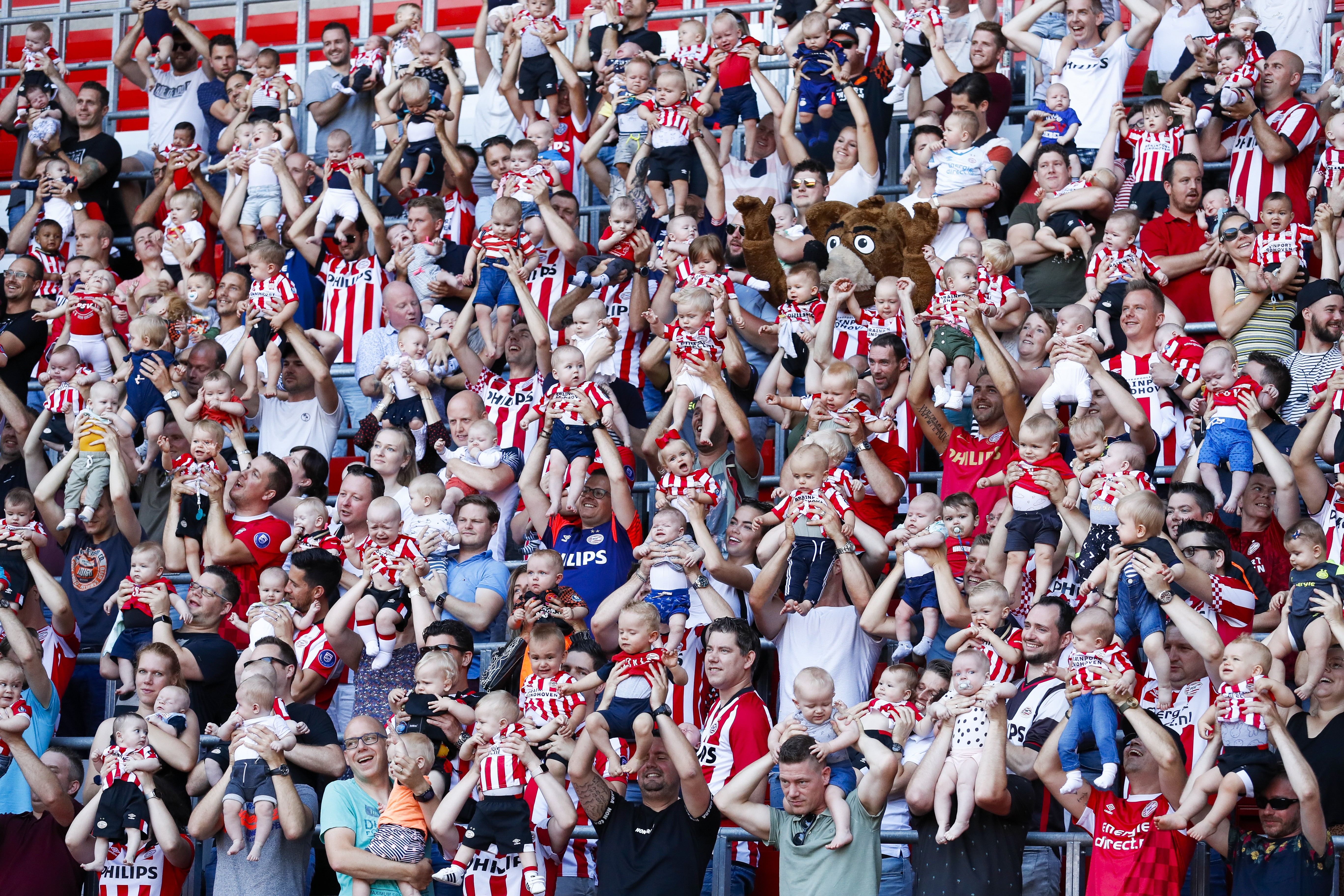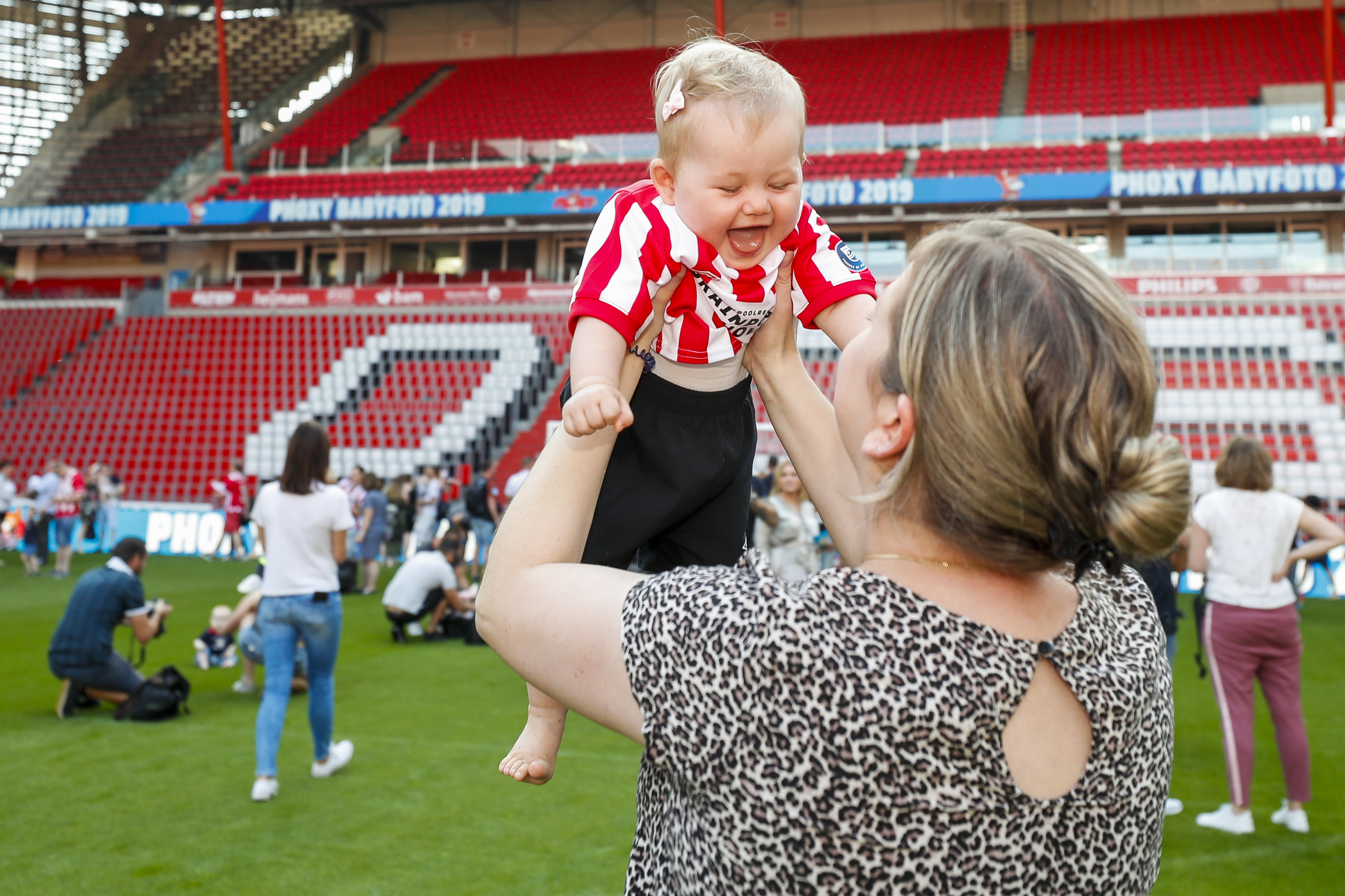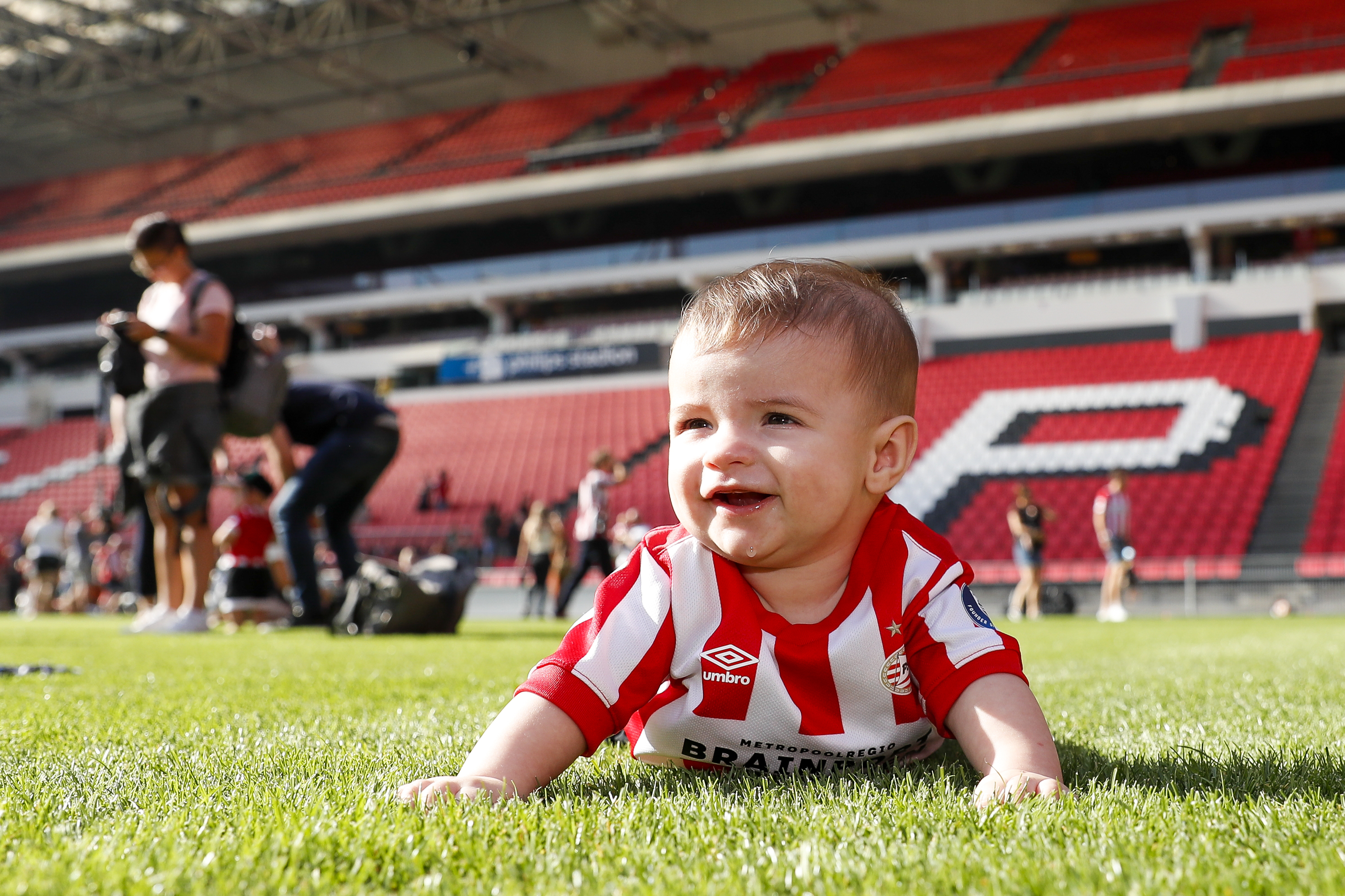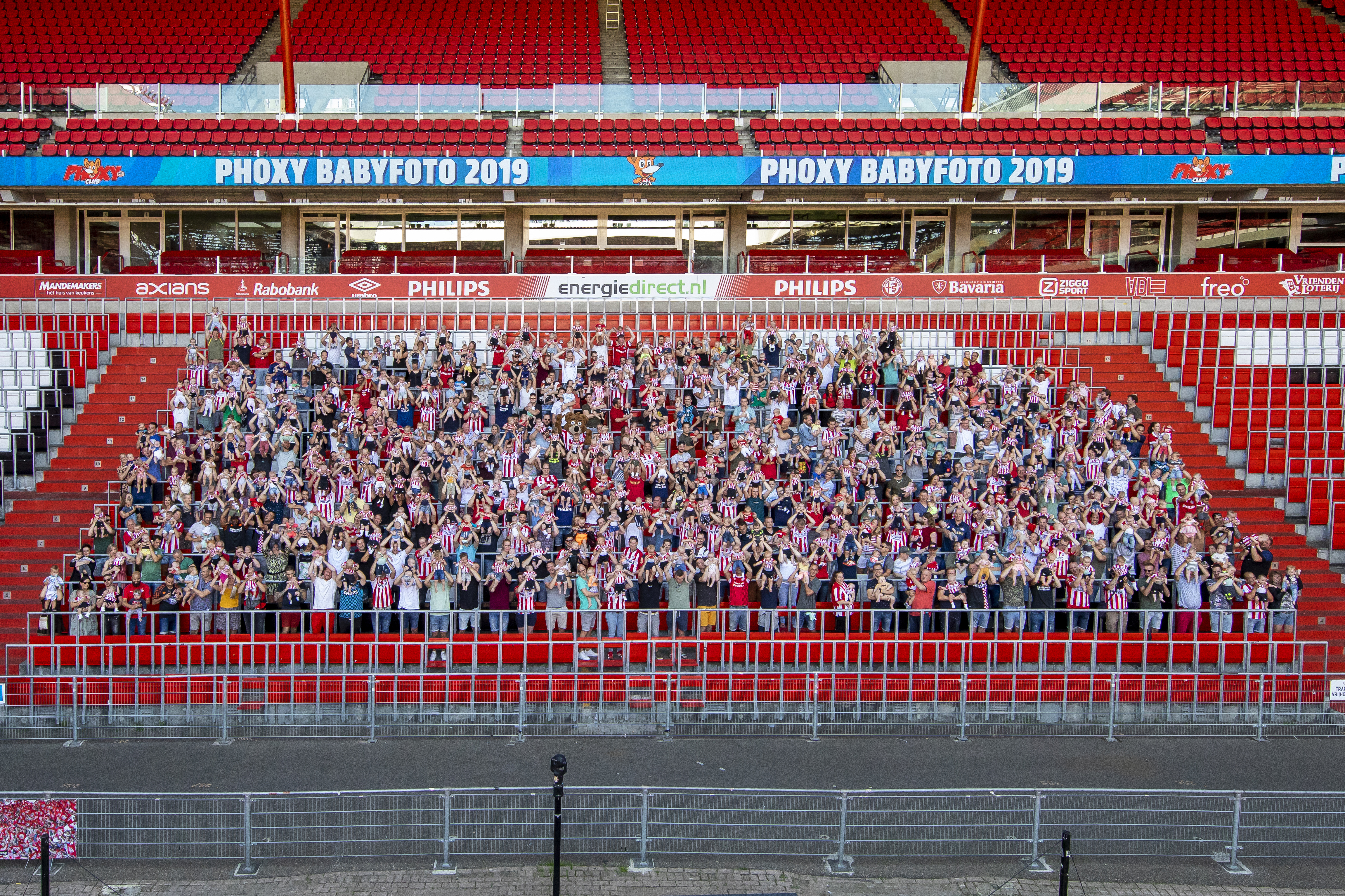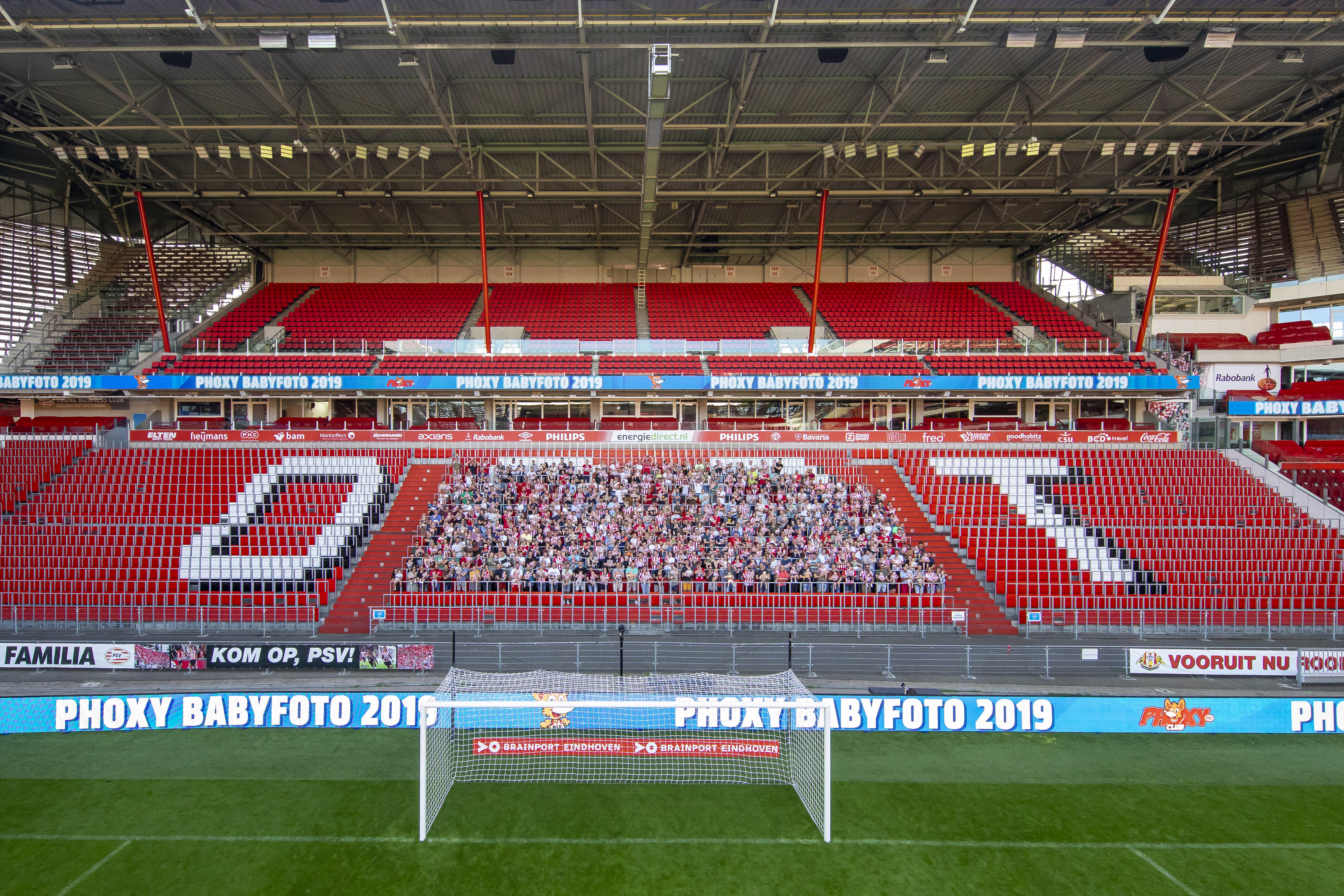 Maar liefst 450 baby's gingen in het Philips Stadion met Phoxy op de jaarlijkse babyfoto. Naast de groepsfoto mochten de ouders en de kinderen ook foto's maken op de tribune, het veld en de kleedkamer van PSV.