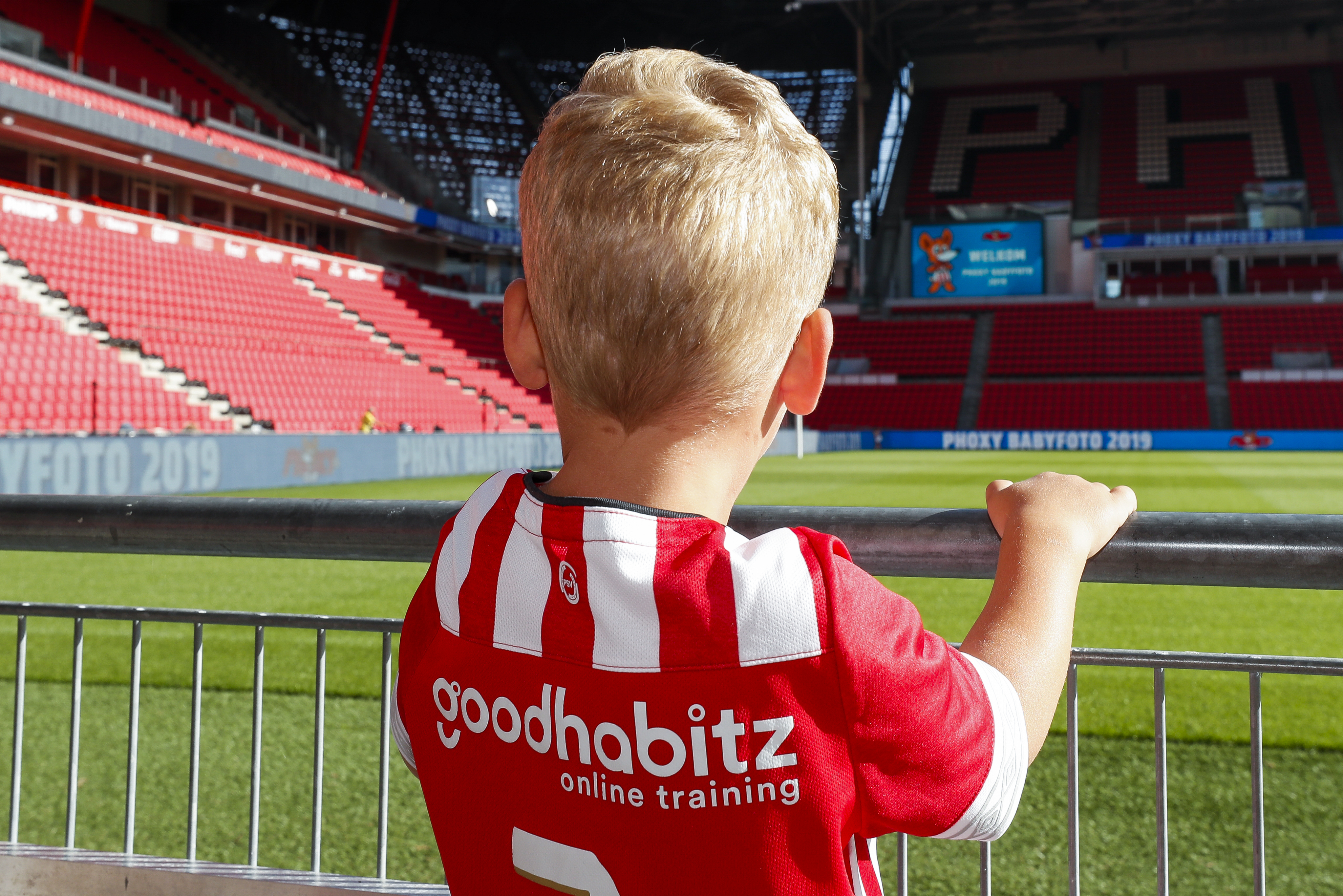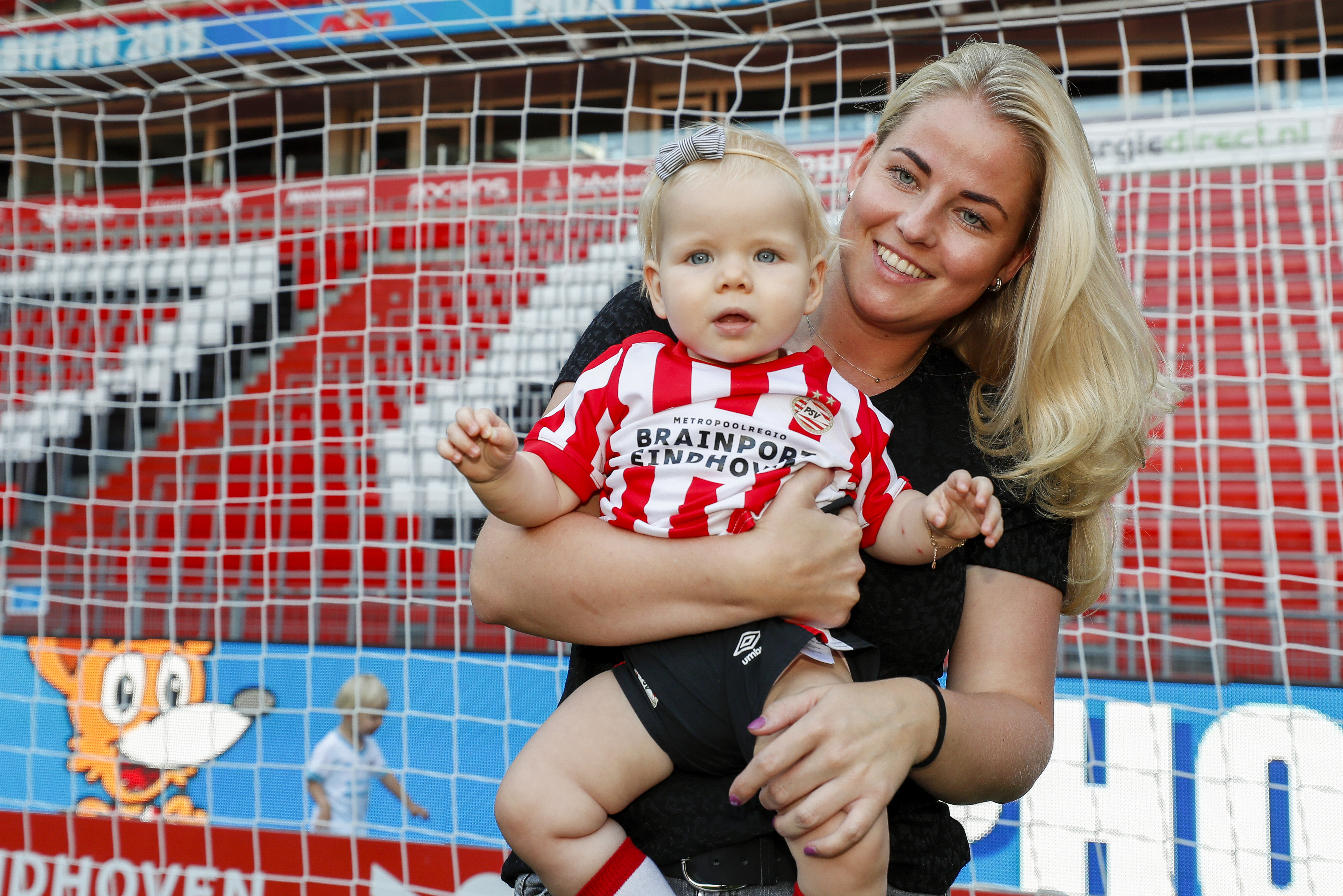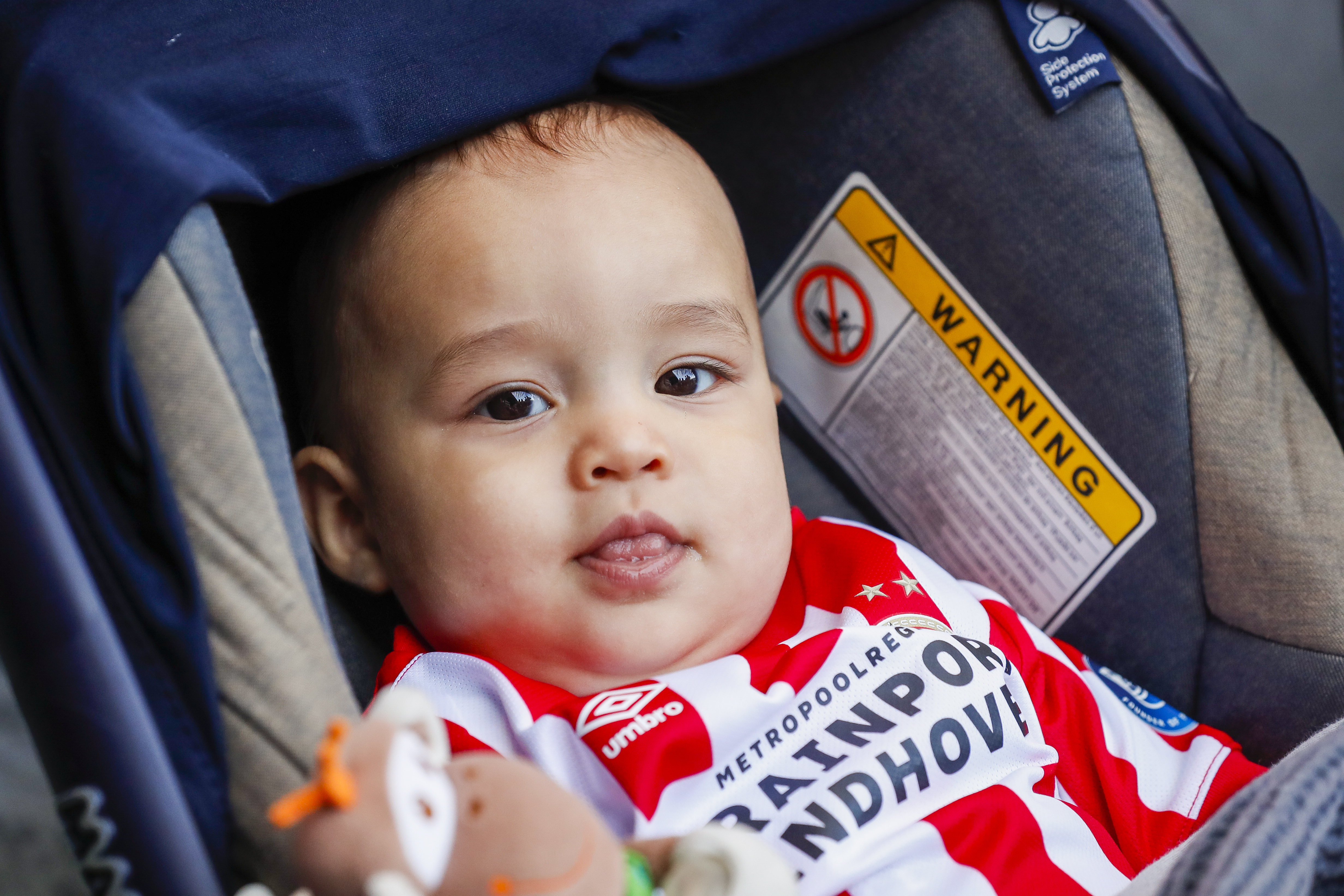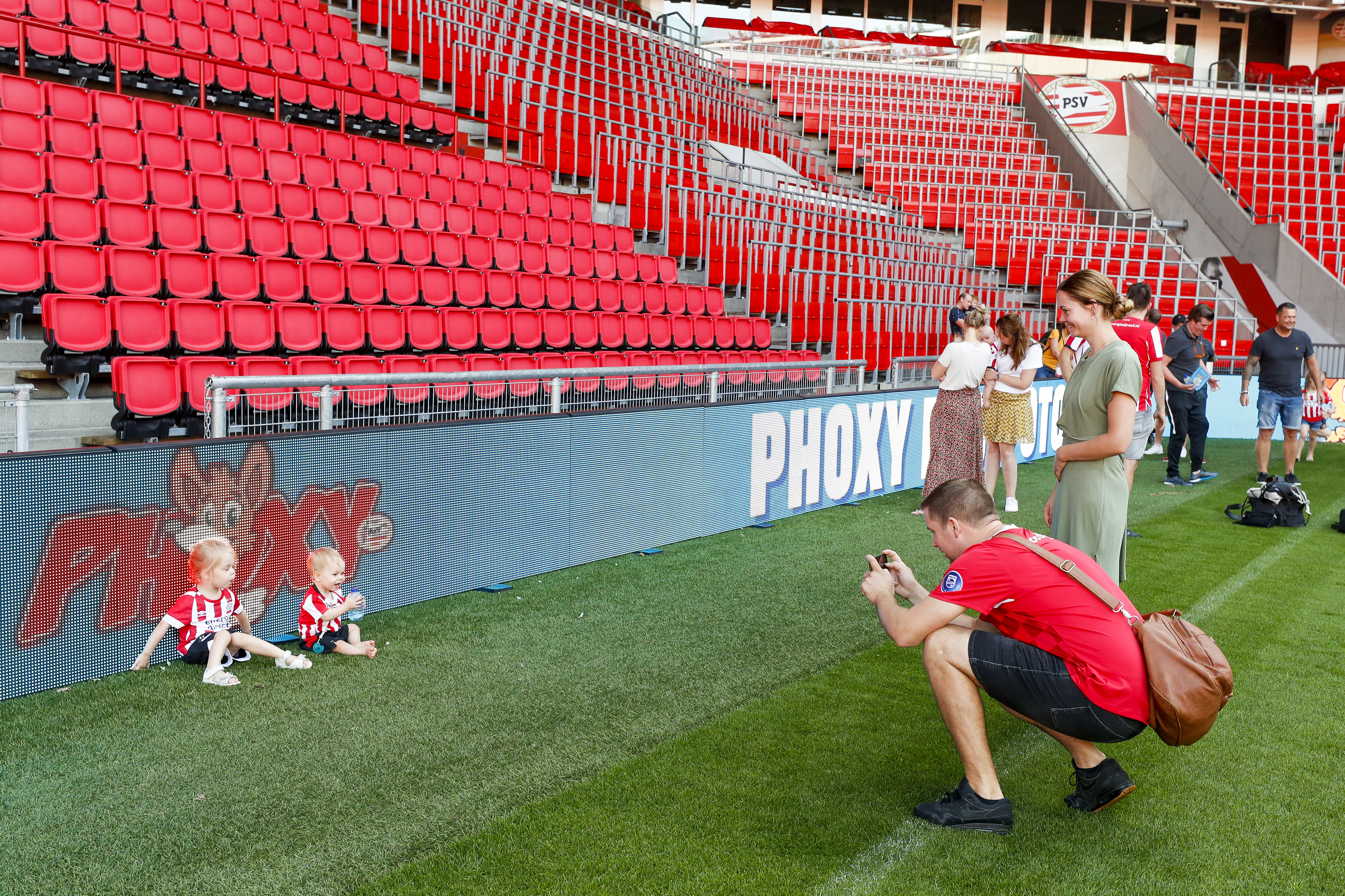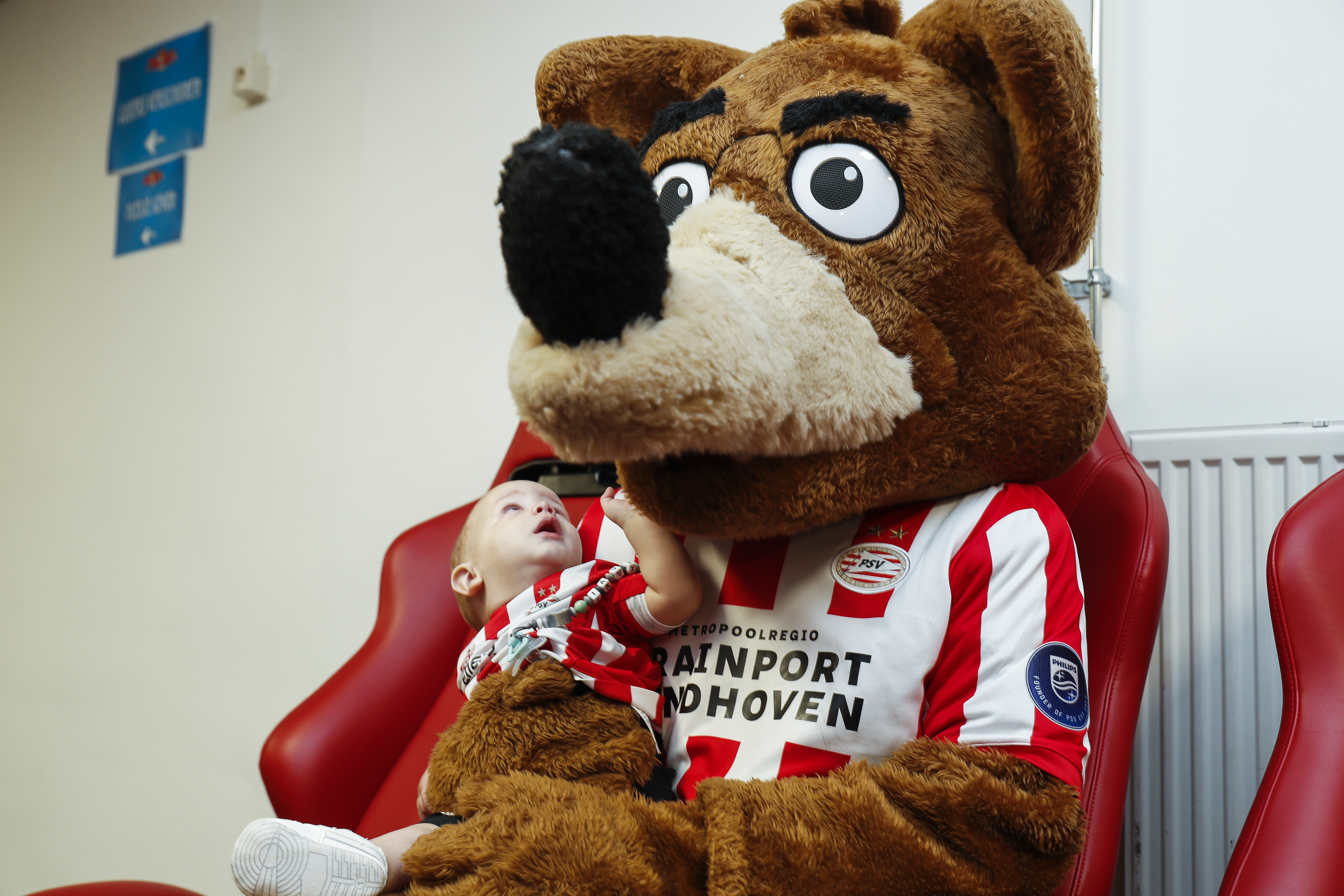 Maar liefst 450 baby's gingen in het Philips Stadion met Phoxy op de jaarlijkse babyfoto. Naast de groepsfoto mochten de ouders en de kinderen ook foto's maken op de tribune, het veld en de kleedkamer van PSV.