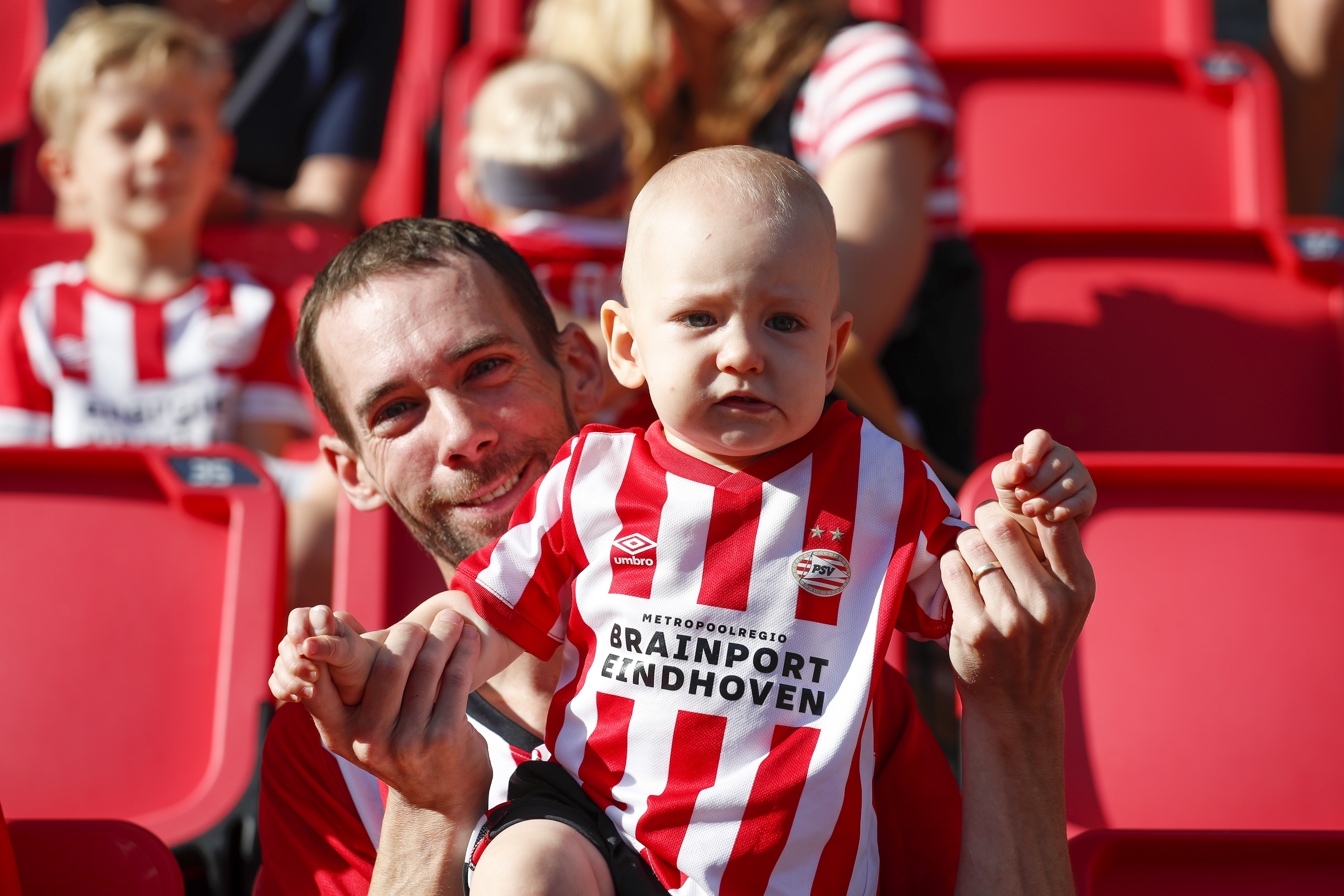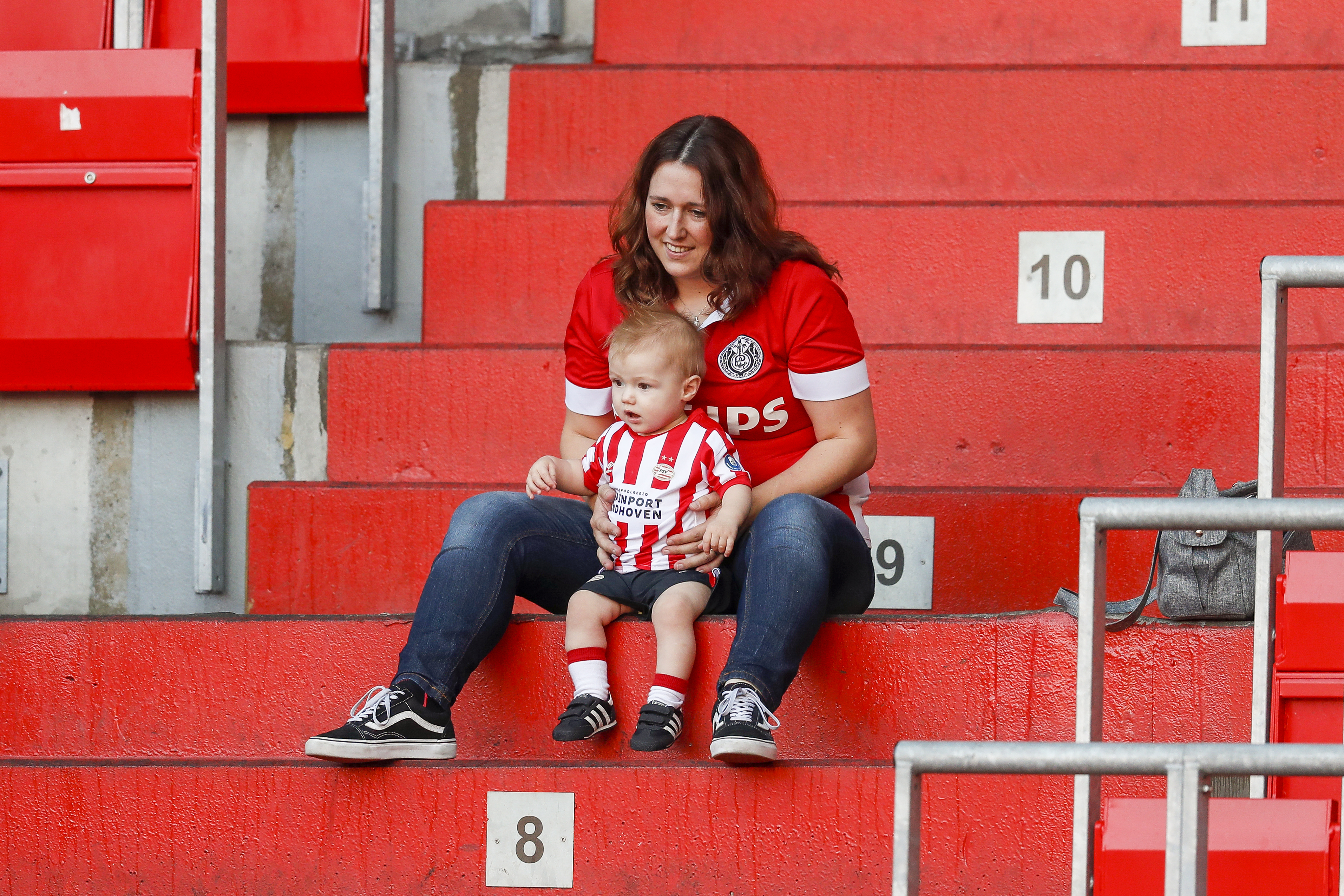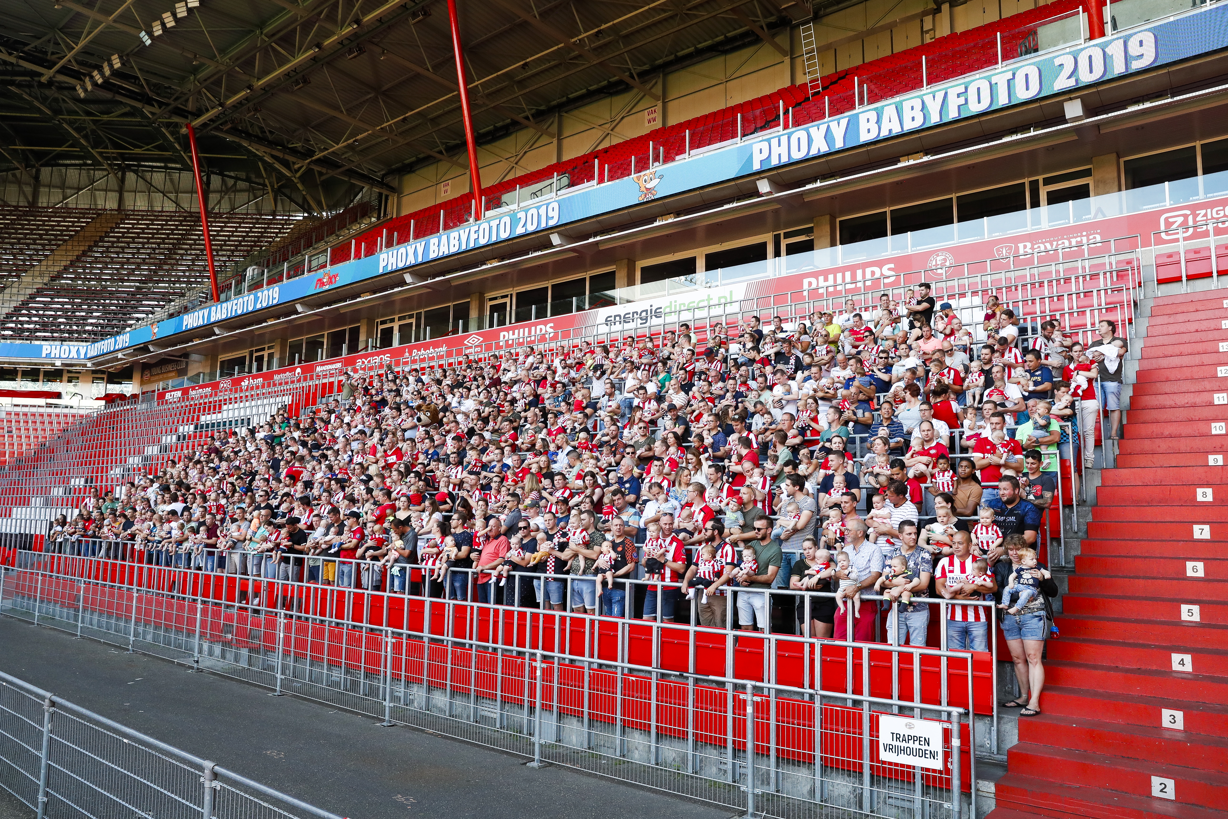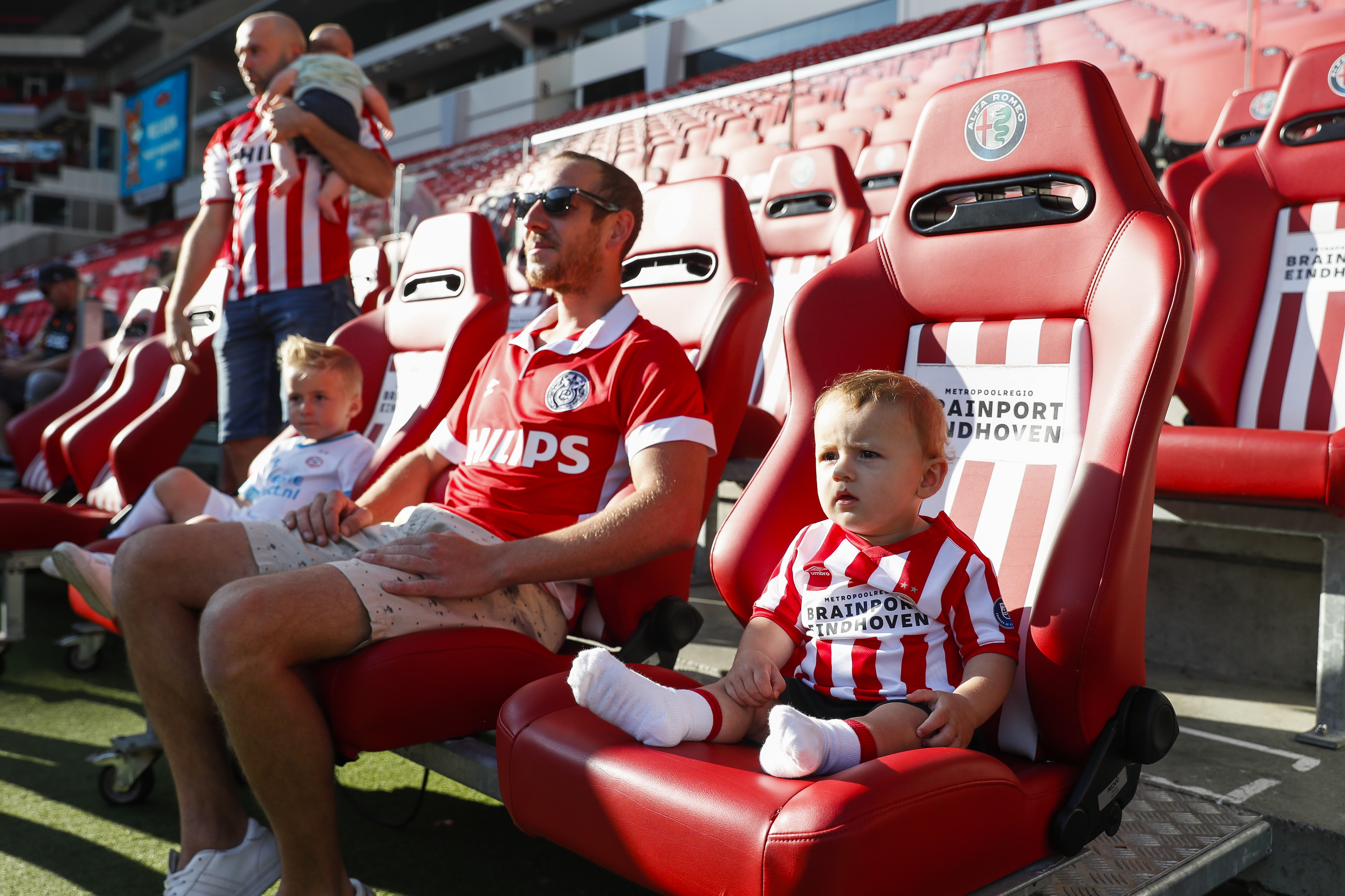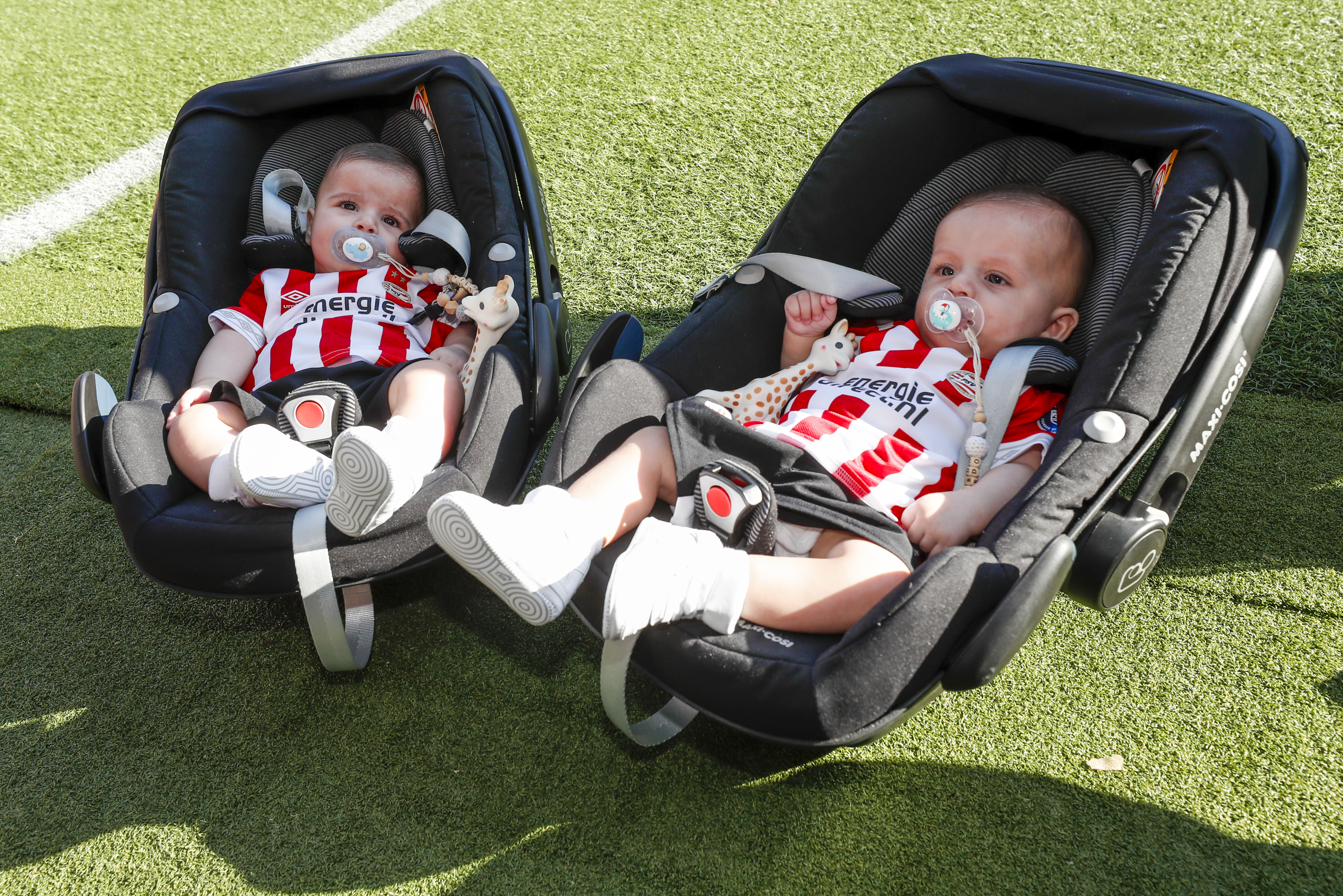 Maar liefst 450 baby's gingen in het Philips Stadion met Phoxy op de jaarlijkse babyfoto. Naast de groepsfoto mochten de ouders en de kinderen ook foto's maken op de tribune, het veld en de kleedkamer van PSV.