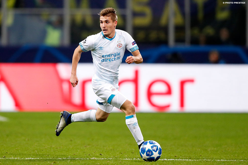 De vrijdag daar aan voorafgaand maakt hij ook al zijn debuut in de Eredivisie. In het met 6-0 gewonnen duel met Excelsior valt de linkspoot in voor Jorrit Hendrix. In het PSV onder 19 van Mark van Bommel blonk hij afgelopen seizoen al uit en sinds Van Bommel hoofdcoach van PSV is, traint hij geregeld mee met het eerste. “Ik ken hem al sinds hij hier is”, vertelt Van Bommel eerder deze maand gevraagd naar de ontwikkeling van zijn pupil. “Ik heb hem vorig jaar aanvoerder gemaakt bij onder 19. Toen zijn we kampioen geworden en was hij een drijvende kracht. Hij snapt het voetbal en doet er alles aan om te winnen. Zoals het hoort. Het maakt hem niet uit of hij bij onder 19, Jong PSV of het eerste elftal speelt. Dat is een groot compliment naar hem. Of ik mezelf in hem herken? Hij heeft die verbetenheid, het ten koste van alles willen winnen. Daar houd ik van, ja.”