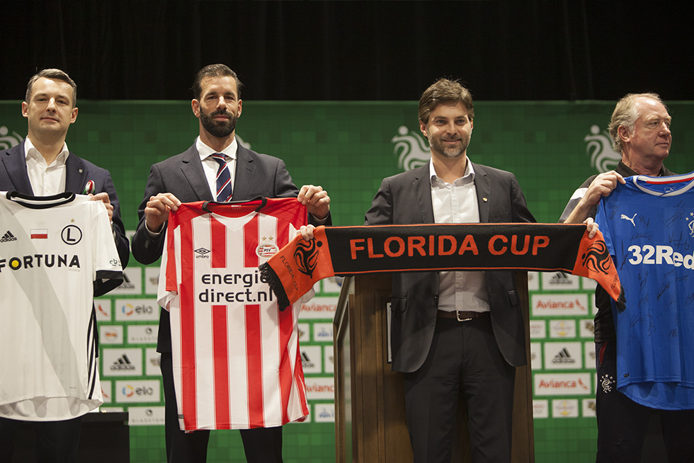 Het Sapphire Falls Resort in downtown Orlando bij Universal Studios is de prestigieuze locatie waar de officiële aftrap werd verricht voor de Florida Cup 2018. 22 cameraploegen, 30 fotografen en meer dan 100 journalisten uit o.a. Brazilië, Mexico, Colombia en Nederland waren aanwezig in de zaal. Toon Gerbrands, Marcel Brands en Ruud van Nistelrooy vertegenwoordigen PSV.