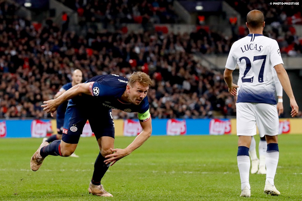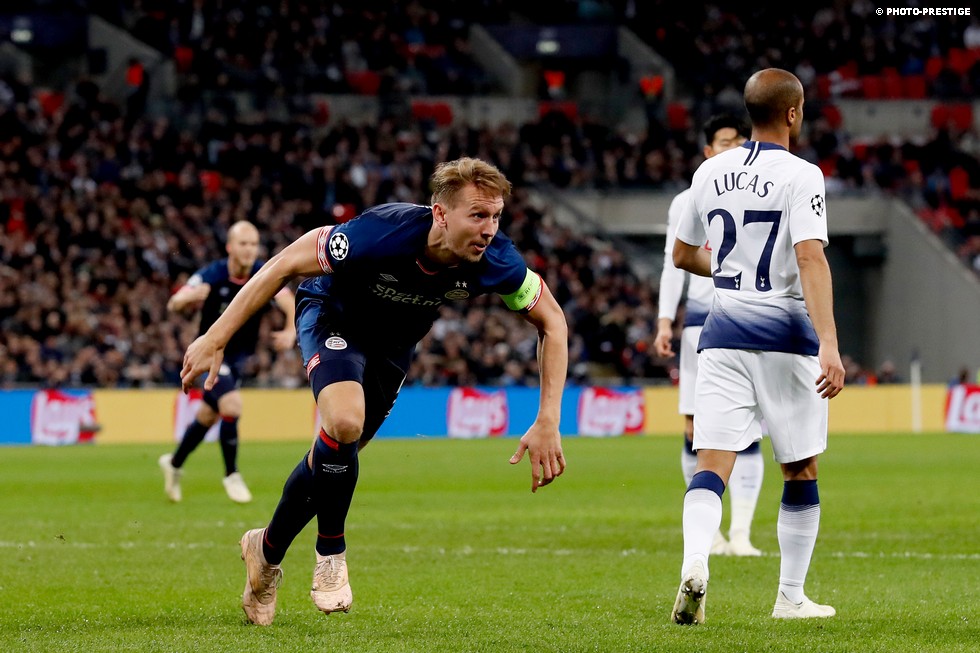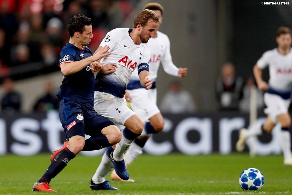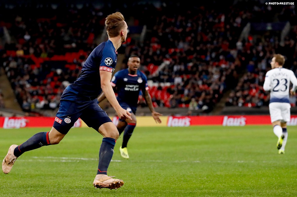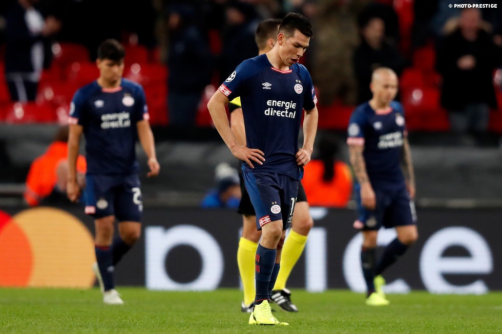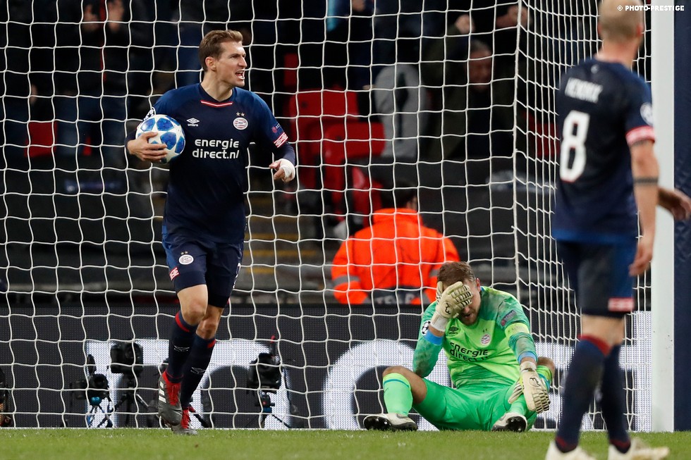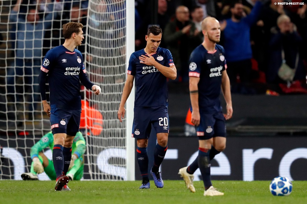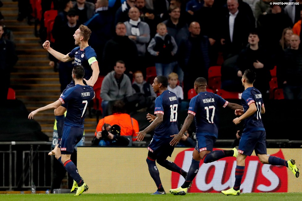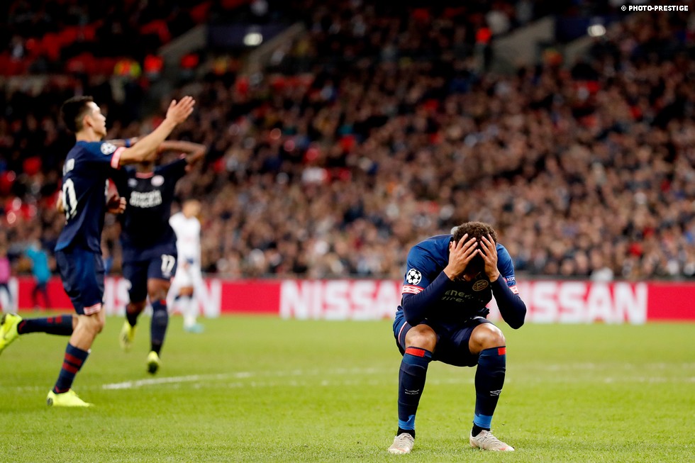 De teleurstelling was van de gezichten van de PSV'ers af te lezen toen Harry Kane Tottenham Hotspur in de slotseconden van de officiële speeltijd op 2-1 zette. Door de nederlaag in Londen is de ploeg van Mark van Bommel uitgeschakeld in de UEFA Champions League. Een fotoverslag van een heroïsch gevecht op Wembley, waar PSV lang droomde van een stunt.