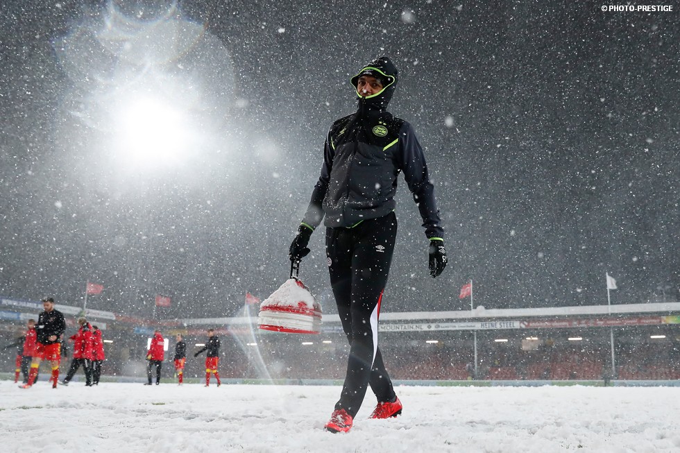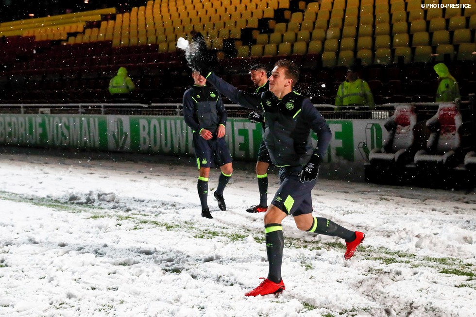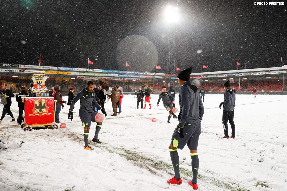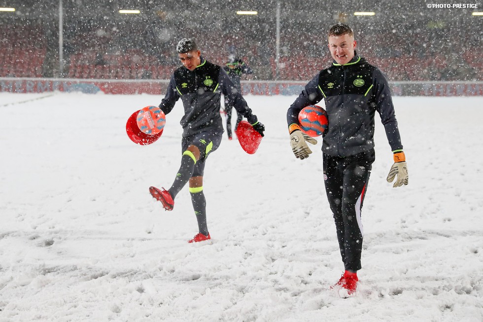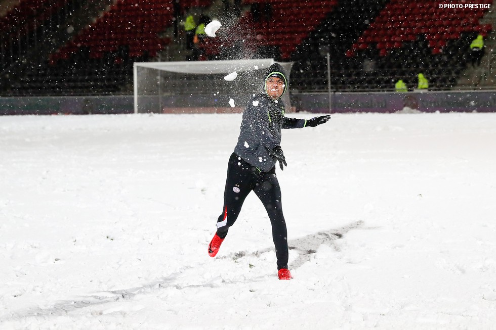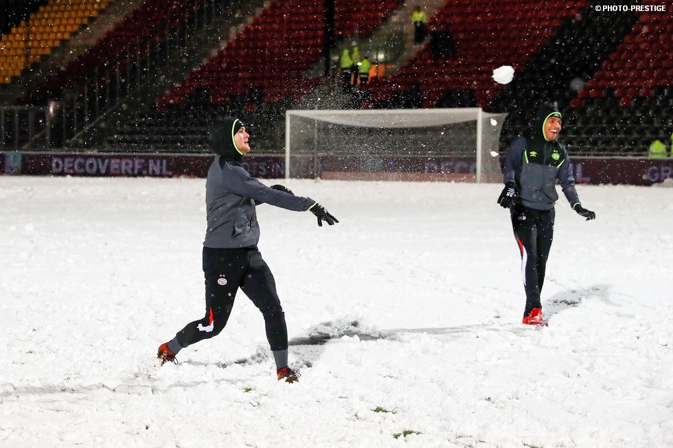 De wedstrijd ging niet door, maar gespeeld werd er toch even in Deventer. Om precies te zijn een sneeuwballengevecht. Zo was Jong PSV toch niet helemaal voor niks naar de Adelaarshorst afgereisd. Een fotoverslag.
