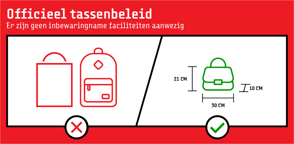 Tassen met een hoogte tot 21 centimeter, een horizontale lengte van niet meer dan 30 centimeter en een breedte van maximaal 10 centimeter zijn wél toegestaan. Houd daarbij in het achterhoofd dat er geen mogelijkheid is om deze dan op te bergen in het Philips Stadion.