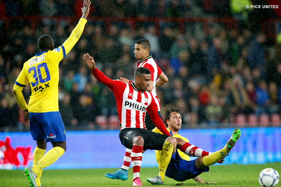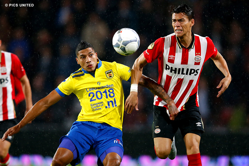 Ten opzichte van het duel van zaterdag wijzigde Phillip Cocu zijn elftal voor de bekerwedstrijd op drie plaatsen. Remko Pasveer, Stijn Schaars en Jürgen Locadia mochten aantreden in plaats van Jeroen Zoet, de geschorste Davy Pröpper en Luciano Narsingh. Juist de vervanger van die laatste liet zien dat die keuze terecht was. In de zestiende minuut was Locadia van alle spelers in het zestienmetergebied van SC Cambuur het meest attent na een hoekschop van Maxime Lestienne, waarna hij via de binnenkant van de paal afrondde: 1-0. Niet eens zo gek veel later bood diezelfde Locadia De Jong de kans om de score op te voeren, maar een Fries been blokkeerde de poging van de PSV-aanvoerder. Op het half uur kreeg De Jong opnieuw de kans de score te verdubbelen – dit keer op aangeven van Lestienne – maar weer stond het vizier niet helemaal op scherp. Scherp was ook Kai Heerings niet in de 43e minuut, want via zijn been verdween een voorzet van Santiago Arias wél in het doel en zo tekende de Cambuur-verdediger onbedoeld voor een comfortabele 2-0 ruststand voor PSV.