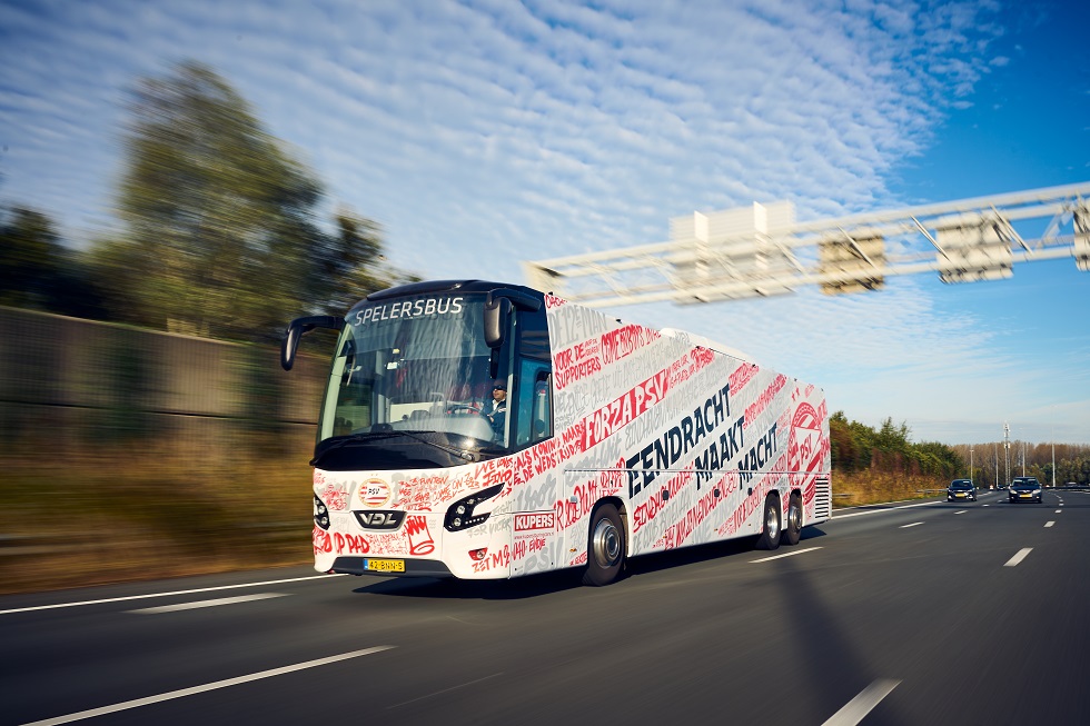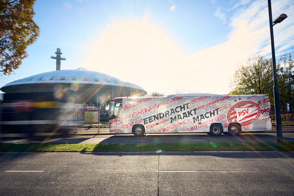 De spelers van PSV reizen zondag in een speciale bus naar het stadion van Ajax, de Johan Cruijff ArenA. Op de buitenkant van de spelersbus staan teksten om de spelers en trainer Ruud van Nistelrooij succes te wensen voor de wedstrijd. De fans van PSV hebben deze teksten ingestuurd, omdat zij zelf niet bij de wedstrijd aanwezig mogen zijn.