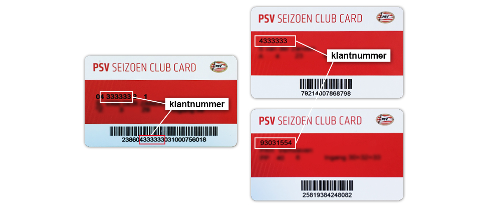 PSV.nl/tickets functioneert optimaal wanneer je inlogt met je klantnummer. Dit klantnummer (4xxxxxx) vind je in de barcode van je Seizoen Club Card. Je barcode bestaat uit 24 cijfers, cijfer 6 tot en met 12 is je klantnummer. Heb je onlangs een nieuwe card ontvangen? Dan staat je klantnummer boven je naam en begint deze met 4 of 9.