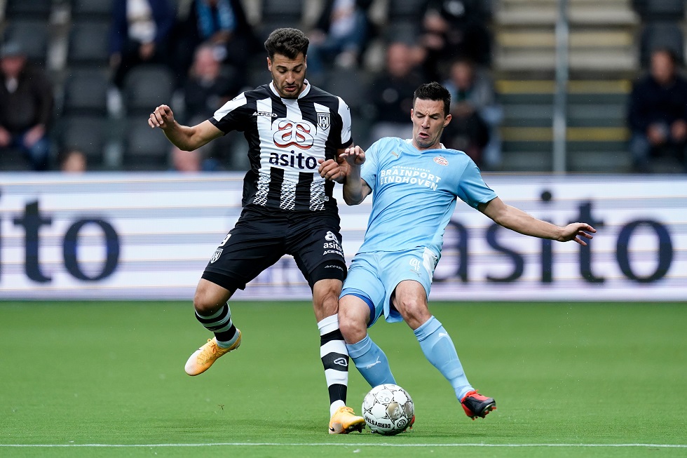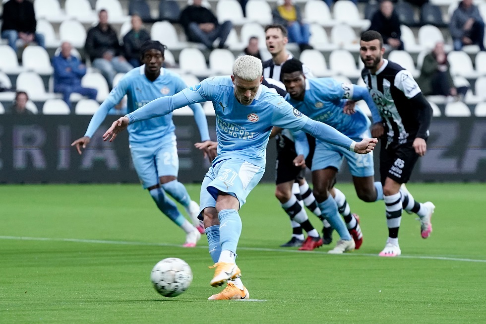 Ondanks dat PSV aan de andere kant nauwelijks iets weg gaf, keek de ploeg na een half uur speler toch tegen een achterstand aan. Nick Viergever, één van de vier nieuwelingen in de ploeg, werkte de bal met zijn schouder weg, maar zag tot zijn eigen verbazen scheidsrechter Kamphuis naar de stip wijzen wegens vermeend hands. De leidsman werd niet tegengesproken door de VAR en constateerde vervolgens dat oud-PSV’er Rai Vloet doelman Yvon Mvogo kansloos liet: 1-0. PSV, dat nog niet kon beschikken over Eran Zahavi, schroefde het tempo daarna wat op, maar slaagde er niet in snel te antwoorden.