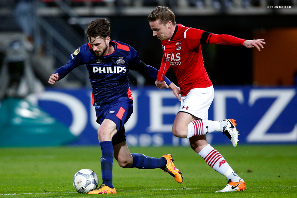Zonder de geblesseerde Guardado, Locadia en de niet geheel fitte Willems stond PSV in de openingsfase in Alkmaar flink onder druk. Sterker nog, PSV mocht van geluk spreken dat het de eerste tien minuten zonder schade doorkwam, want op dat moment had AZ al enkele goede kansen laten liggen. Verdediger Haye raakte van grote afstand bovendien de lat. De aanvalslust van de thuisploeg bood echter ook ruimte voor de aanvallers van PSV en daar profiteerde Pereiro van. De Uruguayaan tikte in de 14e minuut uit een rebound de 0-1 binnen.