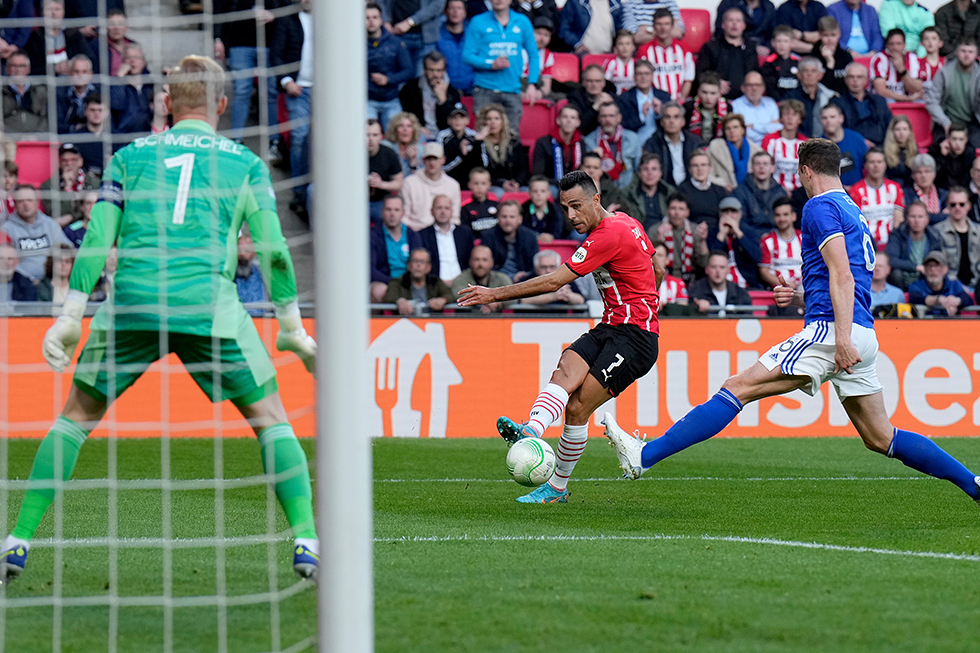 Een kolkend Philips Stadion was het decor voor de cruciale return tegen Leicester City. Na een 0-0 gelijkspel in Engeland kon nog alles gebeuren. Onder het oorverdovend gezang van de duizenden supporters deed PSV er alles aan om de halve finale van de Conference League te bereiken. Na enkele spannende minuten was de eerste grote kans voor PSV. Na een goede loopactie van Philipp Max kon Mario Götze een voorzet geven richting Eran Zahavi. De bal bereikte bijna zijn eindstation, maar de spits kwam net een teenlengte tekort. De Engelse tegenstander bood veel weerstand, maar PSV hield de rug recht. Max had een uitstekende voorzet in huis, waardoor Götze kon schieten. Leicester-doelman Schmeichel wist de inzet ternauwernood te redden. Maar steeds vaker kwam PSV er doorheen op de flanken en kon het voorzetten geven die de Engelse defensie in het nauw dreven.