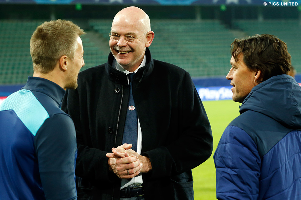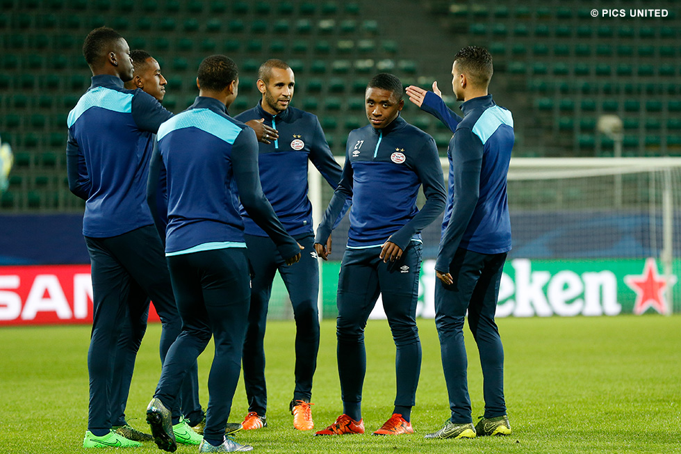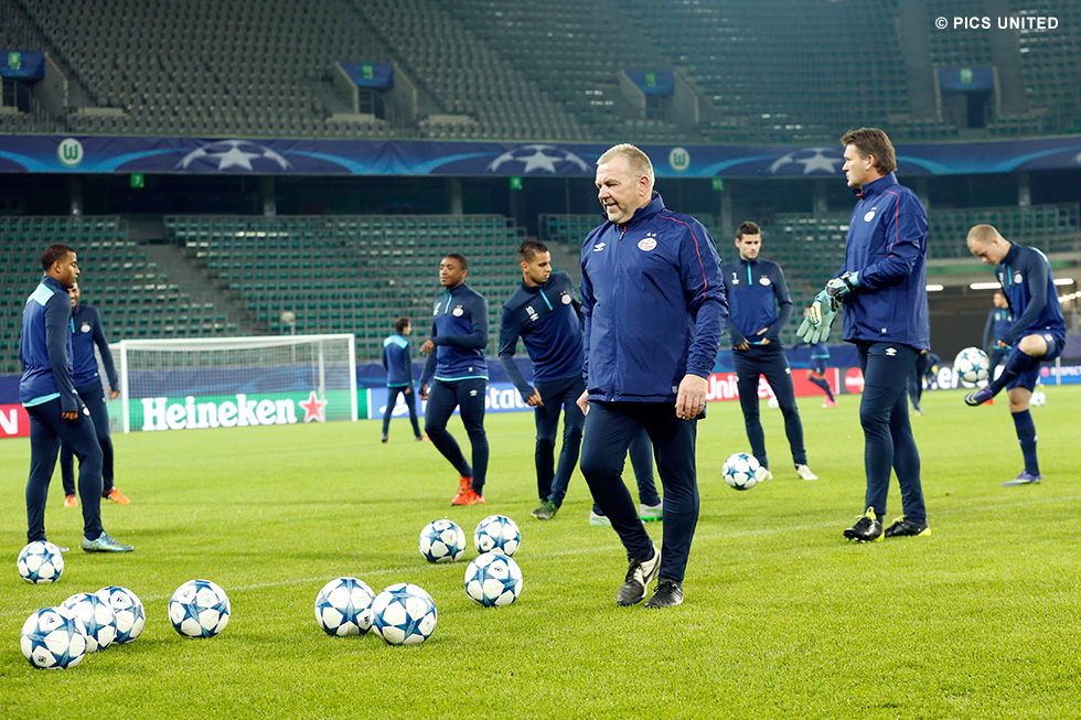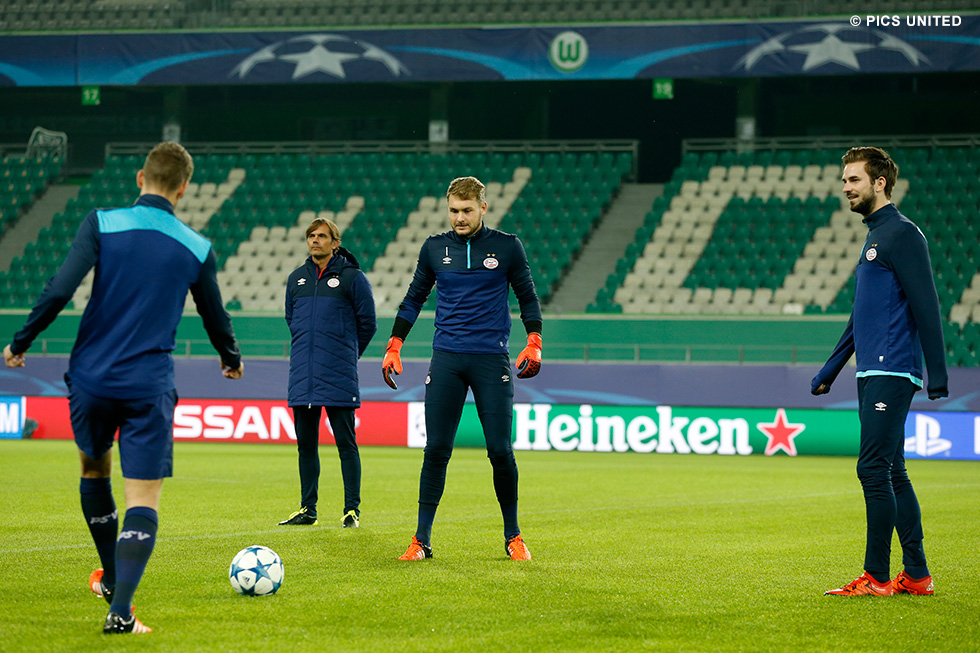 De PSV-selectie verkende dinsdagavond het veld van de Wolfsburg ArenA, dat buiten Champions League-wedstrijden de naam van een groot Duits automerk draagt.