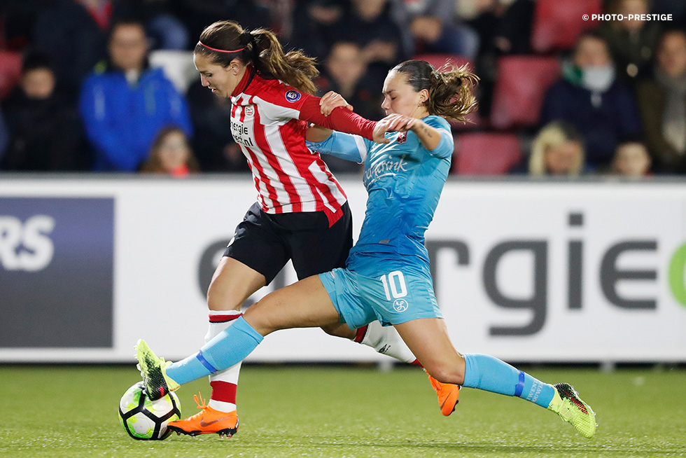FC Twente begon sterk aan de wedstrijd tegen PSV Vrouwen. Angela Christ kon met behulp van de lat op de eerste doelpoging nog redding brengen maar het was in de 4e minuut al raak, 0-1 via Ellen Jansen. PSV kon geen grip krijgen op het spel van de ploeg uit Enschede. Ondanks enkele pogingen van afstand kon het elftal van coach Vuckovic nauwelijks gevaarlijk worden. In de 19e minuut was het Bente Jansen die namens FC Twente vanaf rand zestien doel trof, 0-2. Het grootste wapenfeit van PSV in de eerste helft kwam op naam van Sofia Nati, ze schoot van afstand op de lat. Kort daarna werkte Joëlle Smits een voorzet van de rechterkant behendig binnen, 0-3. Net voor het rustsignaal wees de scheidsrechter naar de stip na een overtreding. Vanity Lewerissa werd gevloerd en schoot zelf de penalty binnen, 1-3.