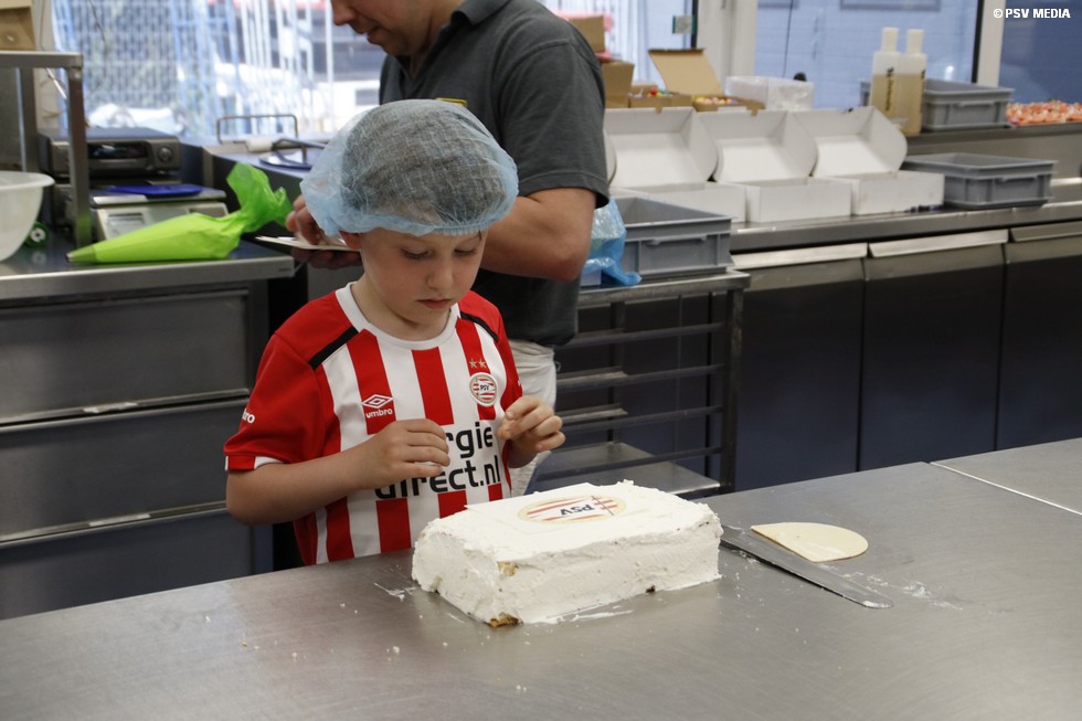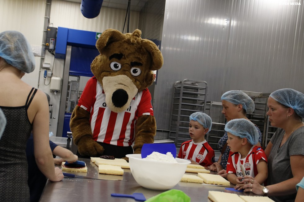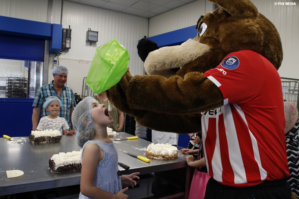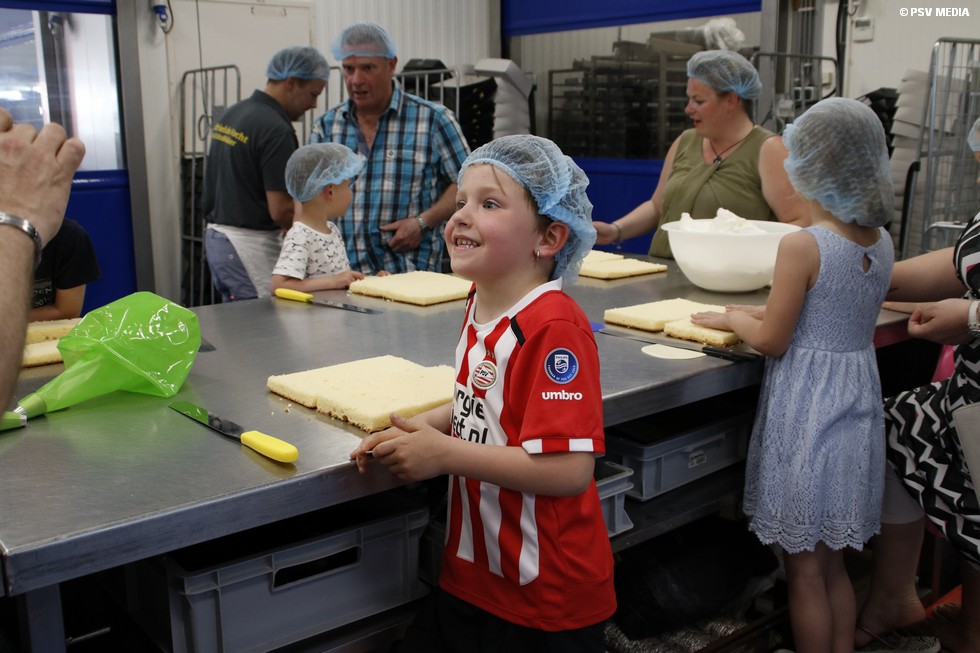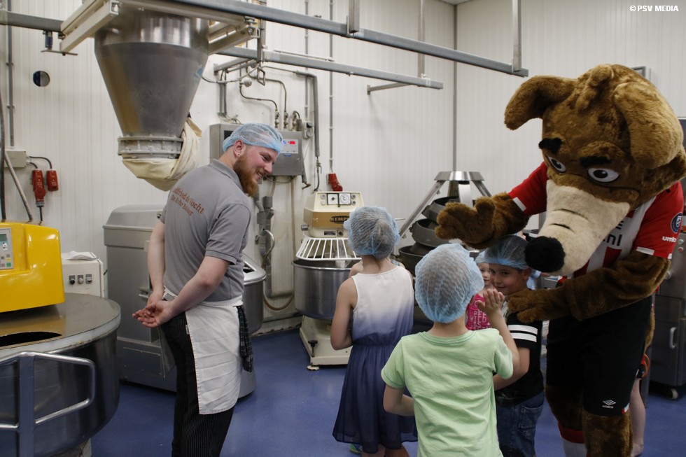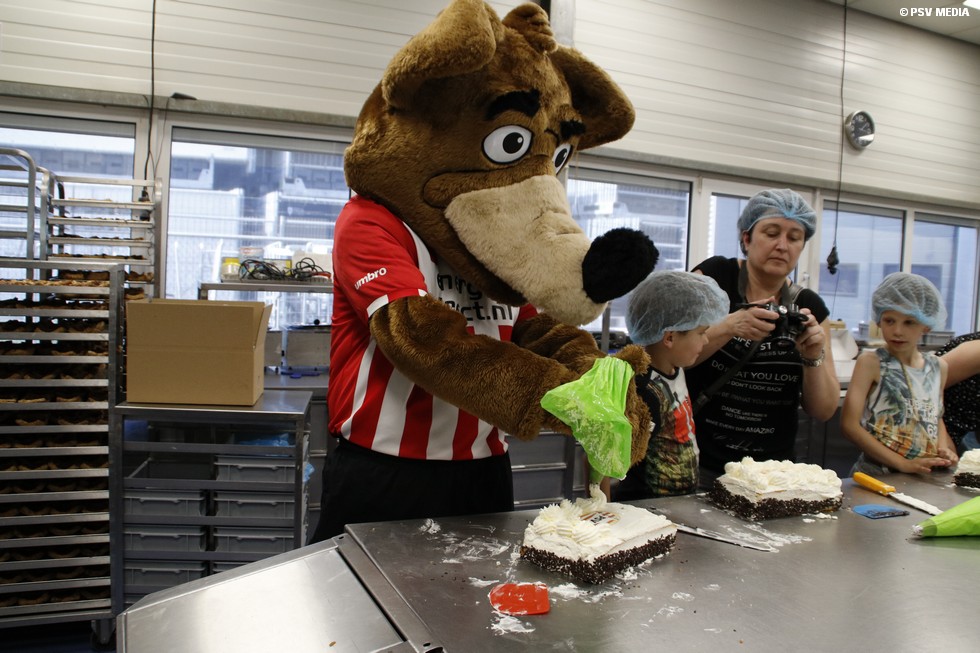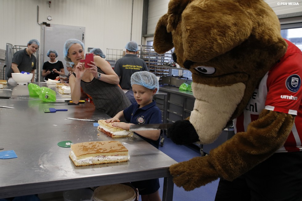 Woensdag 17 mei mochten twintig leden van de PSV Kidsclub een taartje bakken bij De Echte Bakker, Godfried de Vocht. Om te beginnen kregen de kinderen een rondleiding door de bakkerij. Daarna mochten ze zelf aan de slag met marsepein. Na een PSV-muffin en een drankje was het tijd om samen met Phoxy een taart te maken. Zie hier de foto’s van de deze dag.