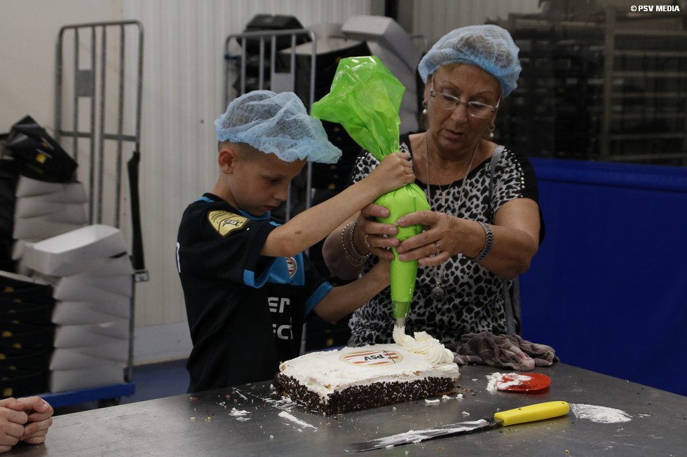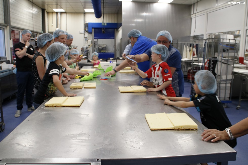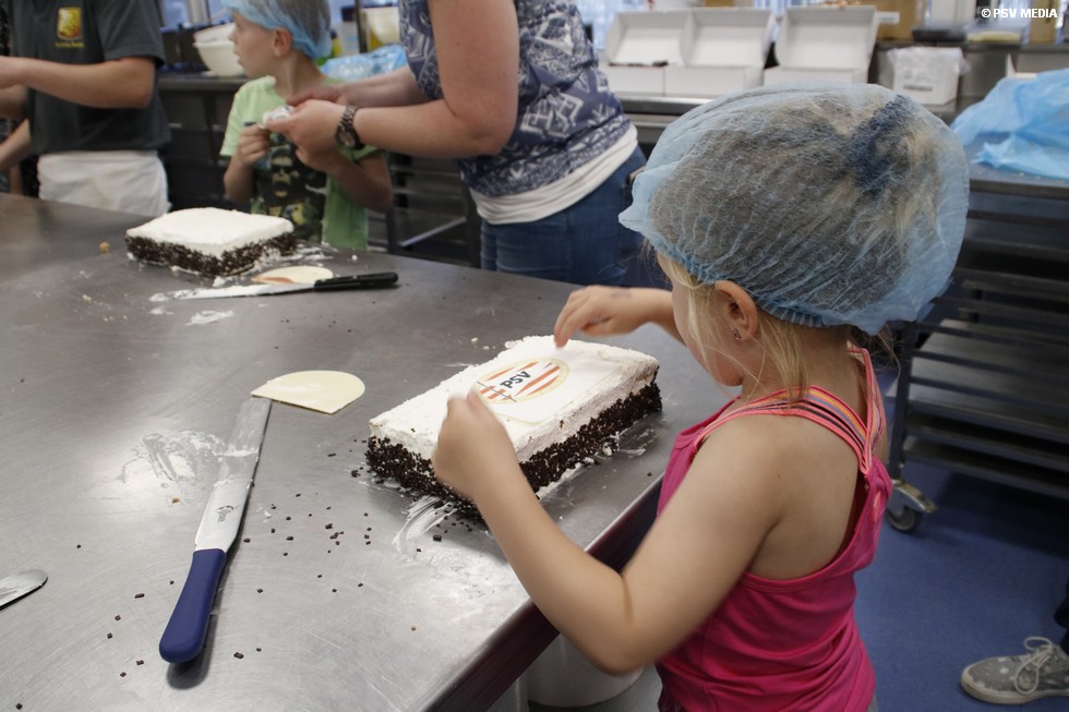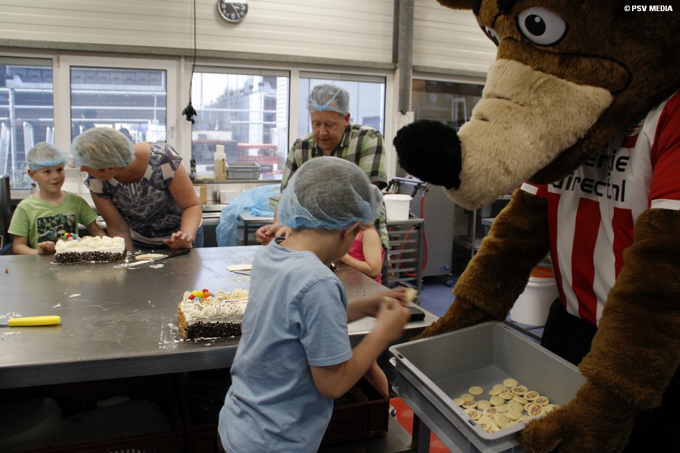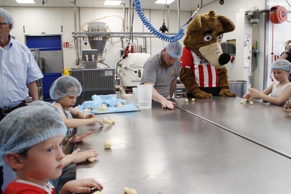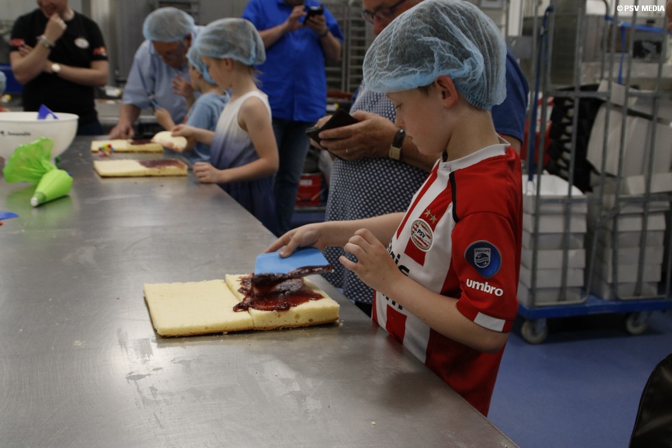 Woensdag 17 mei mochten twintig leden van de PSV Kidsclub een taartje bakken bij De Echte Bakker, Godfried de Vocht. Om te beginnen kregen de kinderen een rondleiding door de bakkerij. Daarna mochten ze zelf aan de slag met marsepein. Na een PSV-muffin en een drankje was het tijd om samen met Phoxy een taart te maken. Zie hier de foto’s van de deze dag.