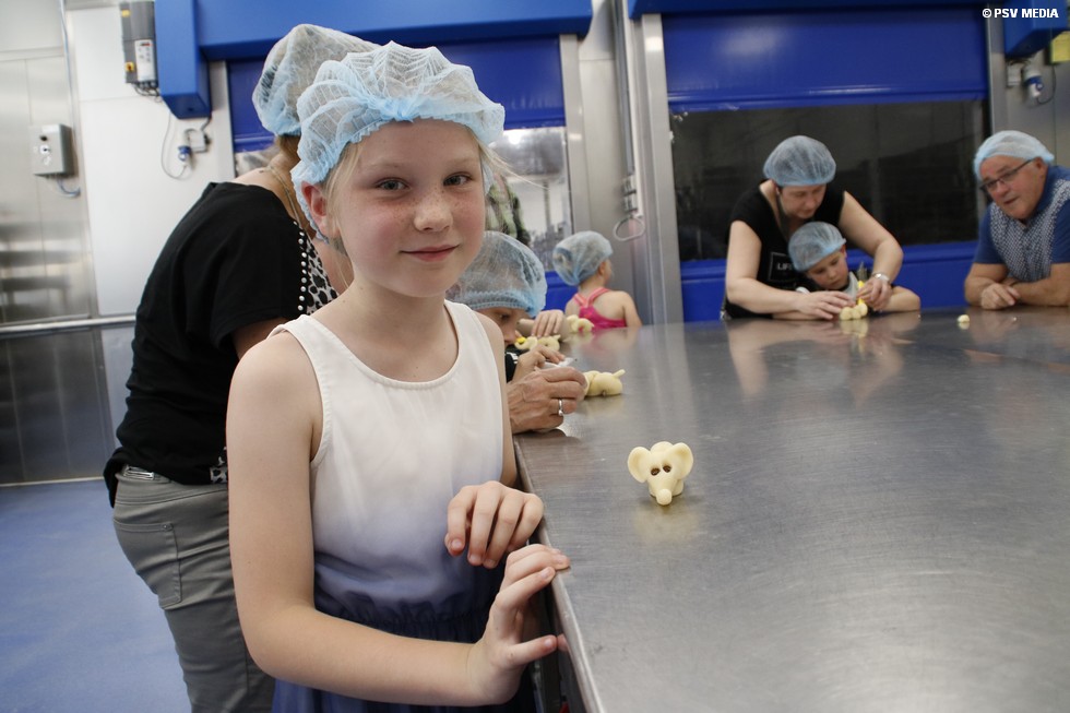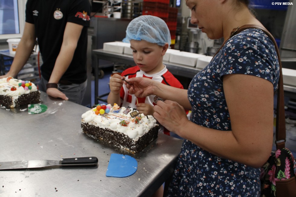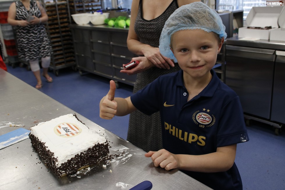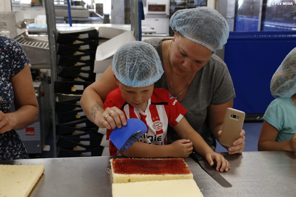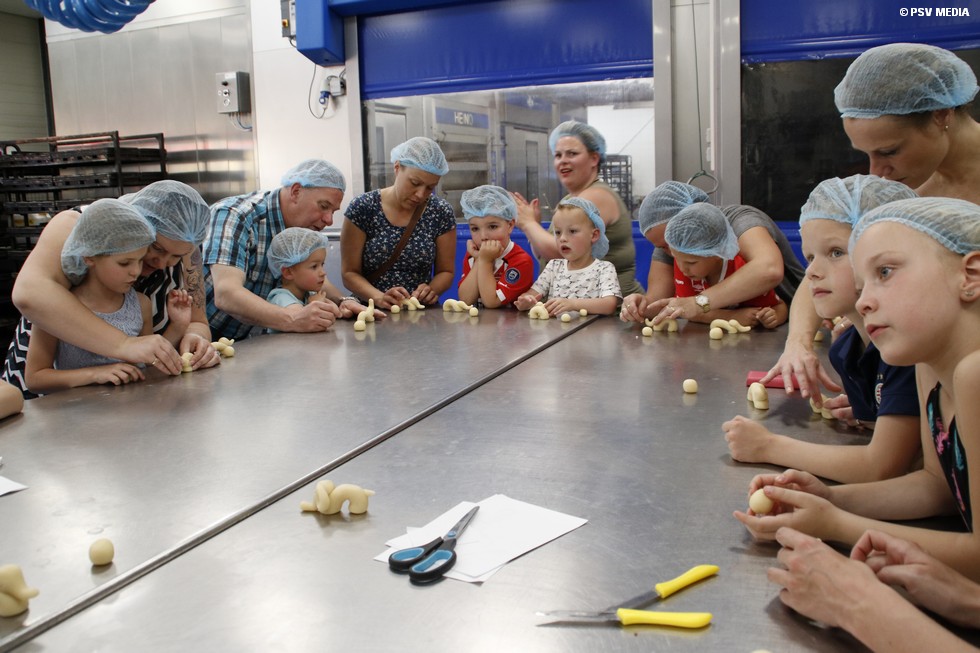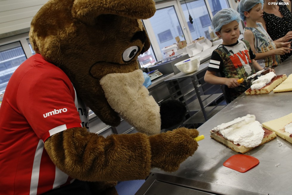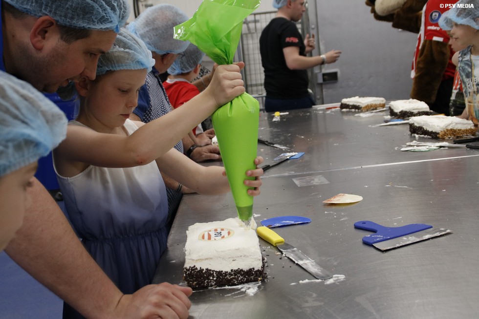 Woensdag 17 mei mochten twintig leden van de PSV Kidsclub een taartje bakken bij De Echte Bakker, Godfried de Vocht. Om te beginnen kregen de kinderen een rondleiding door de bakkerij. Daarna mochten ze zelf aan de slag met marsepein. Na een PSV-muffin en een drankje was het tijd om samen met Phoxy een taart te maken. Zie hier de foto’s van de deze dag.